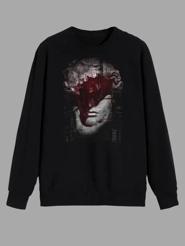 Mitoloji Renkli Heykel Baskılı Siyah Sweatshirt