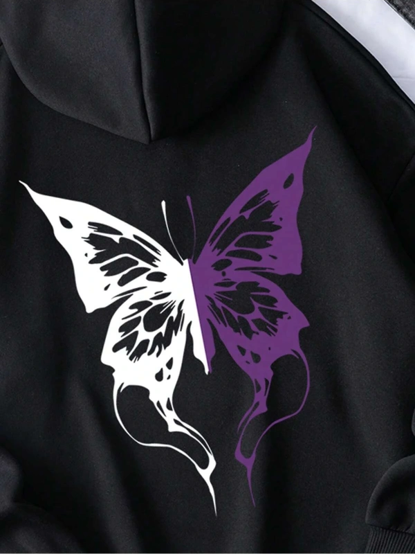 . Essnce Butterfly Print Kangaroo Pocket Drawstring Lined Hoodie Siyah