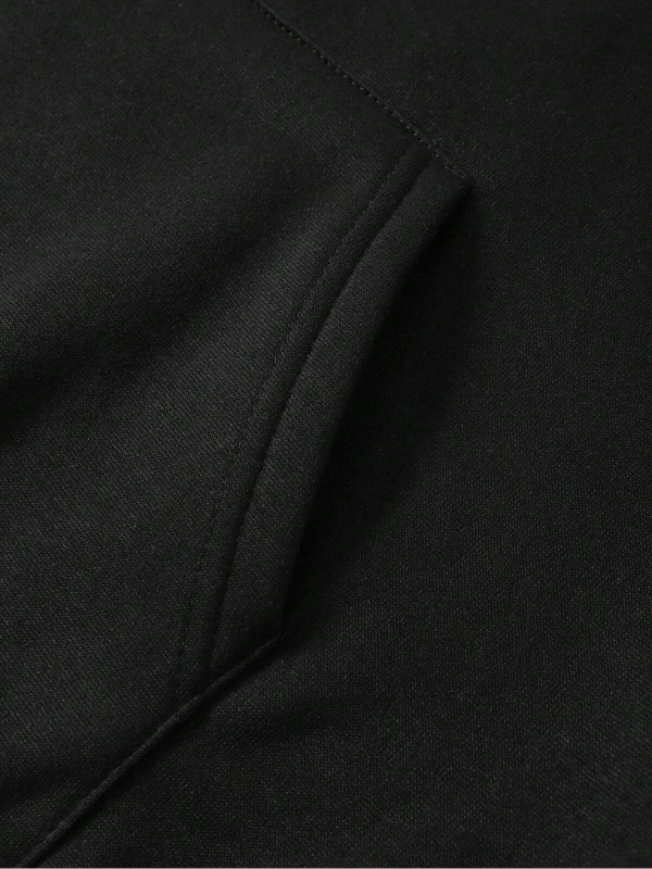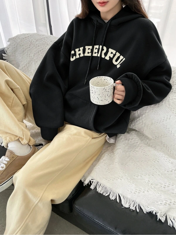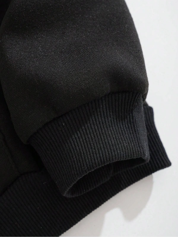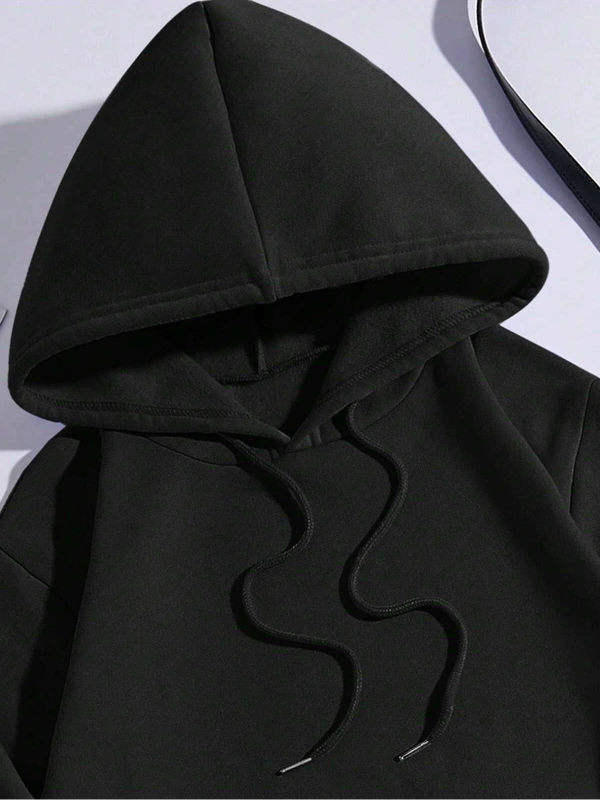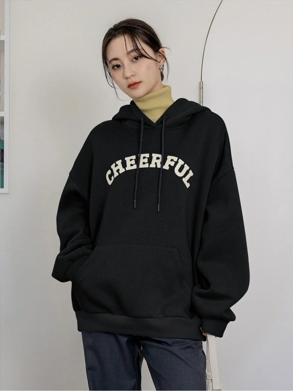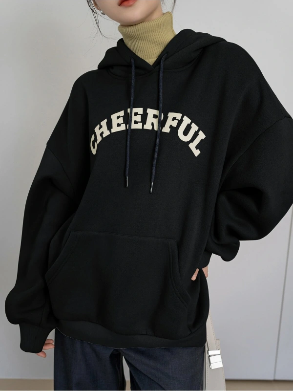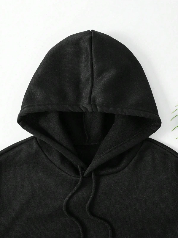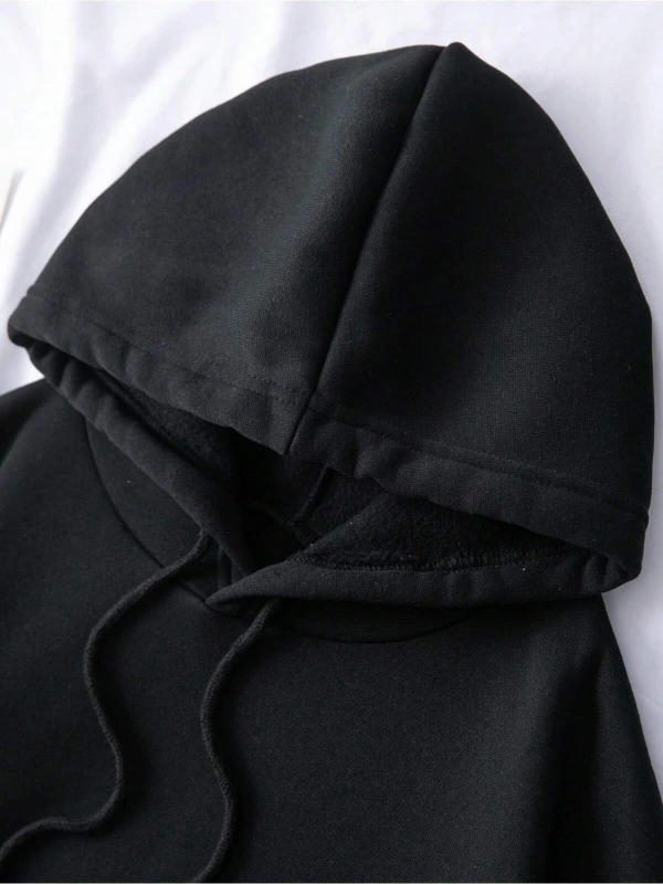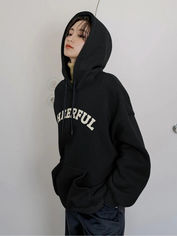 Letter Graphic Kangaroo Pocket Drawstring Lined Hoodie Siyah