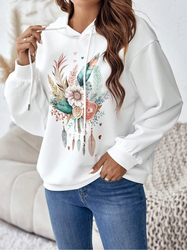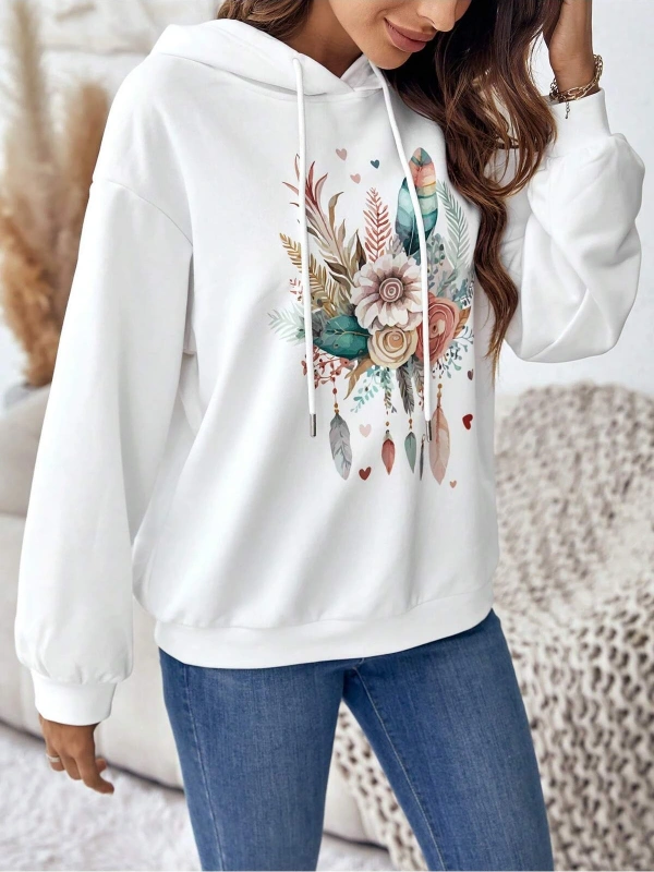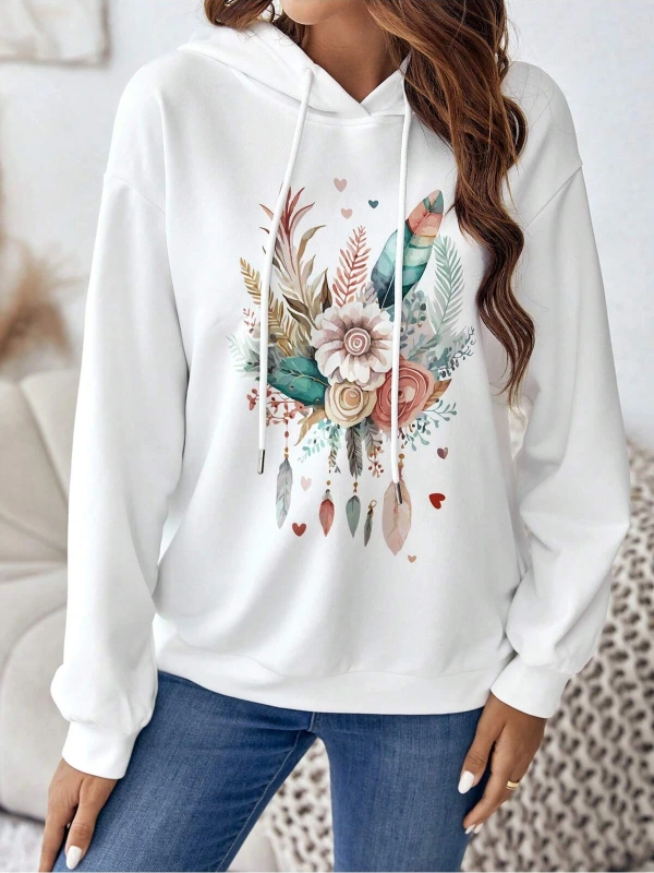 Coke serisi Floral & Feather Print Drop Shoulder Drawstring Hoodie