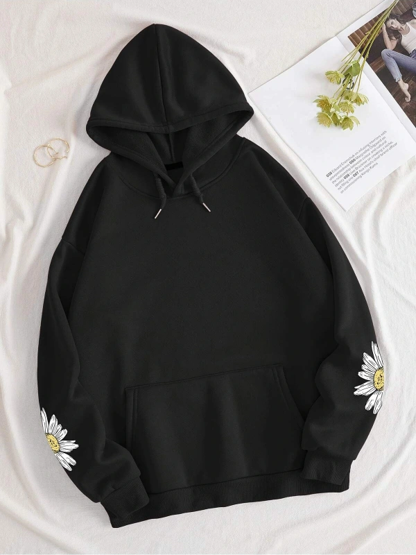 . Essnce Floral & Butterfly Print Kangaroo Pocket Drawstring Hoodie Siyah