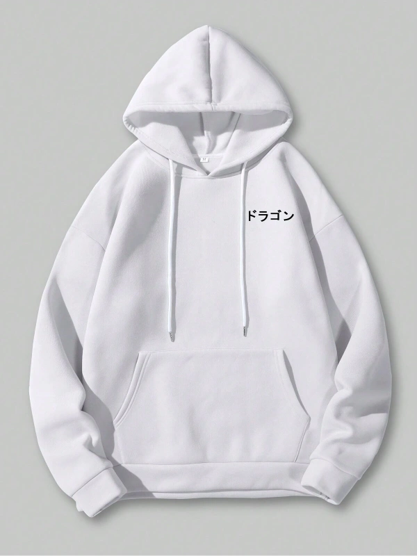 Anime Guys Dragon & Letter Graphic Drawstring Lined Hoodie Beyaz