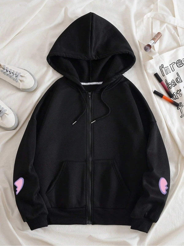 Bear And Heart Print Zip Up Lined Drawstring Hoodie Siyah