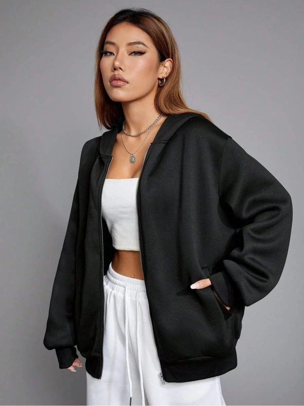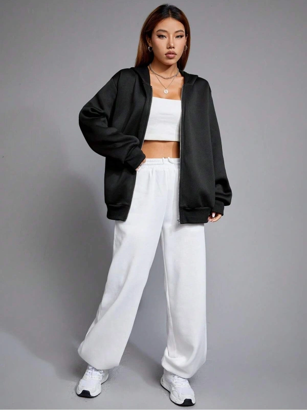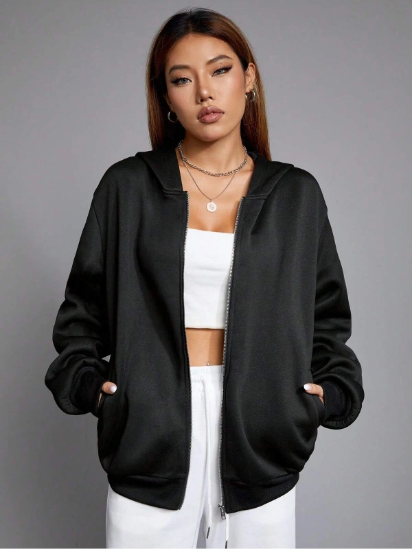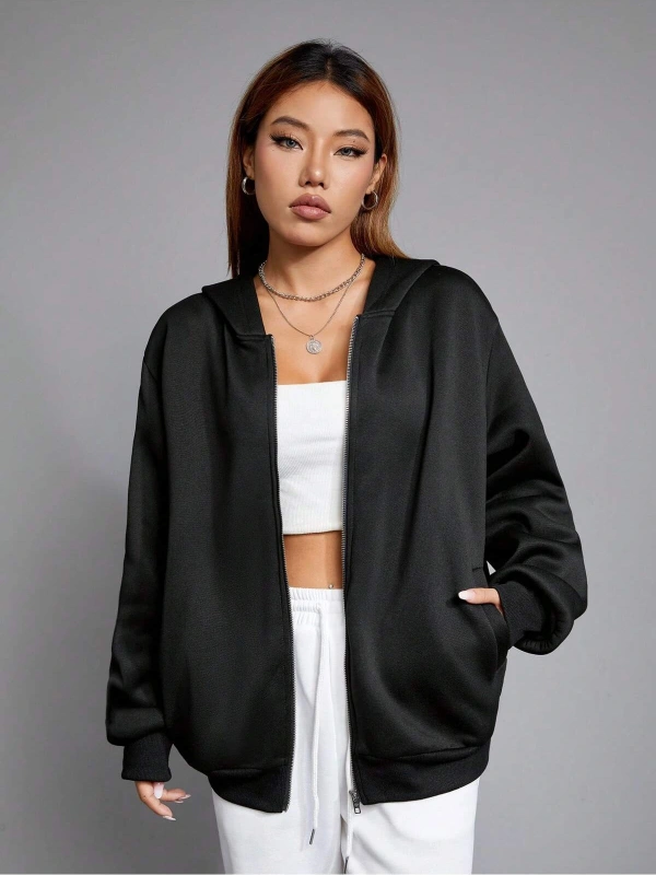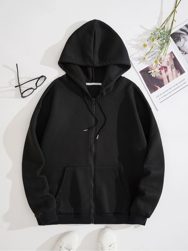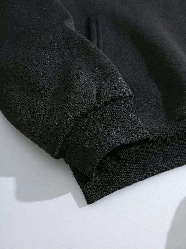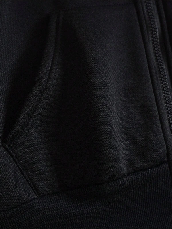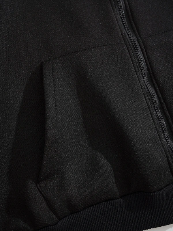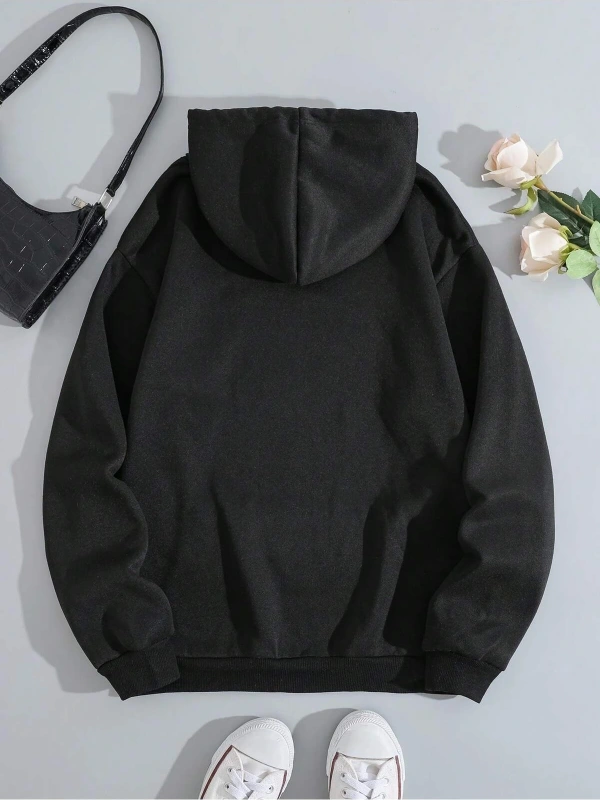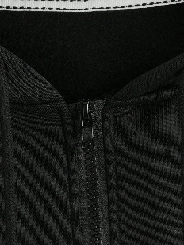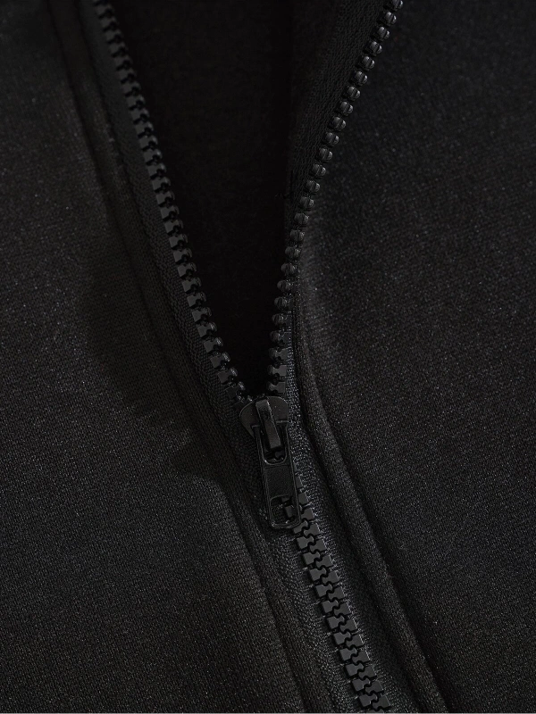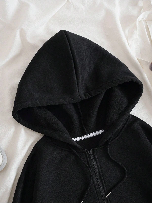 Slogan Graphic Zip Up Drawstring Lined Hoodie Siyah