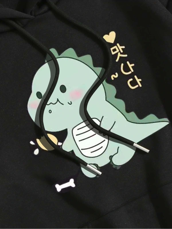 Cartoon And Korean Letter Graphic Drawstring Lined Hoodie Siyah