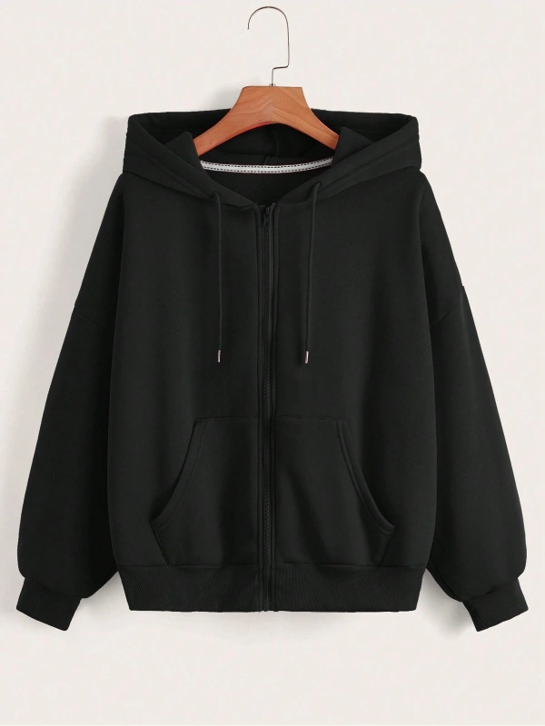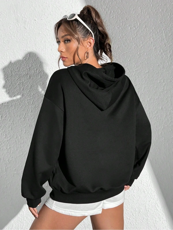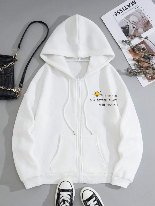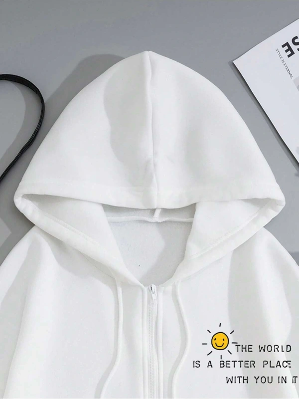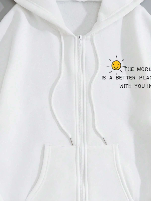 Coke serisi Slogan & Butterfly Print Drop Shoulder Drawstring Zipper Thermal Lined Hoodie