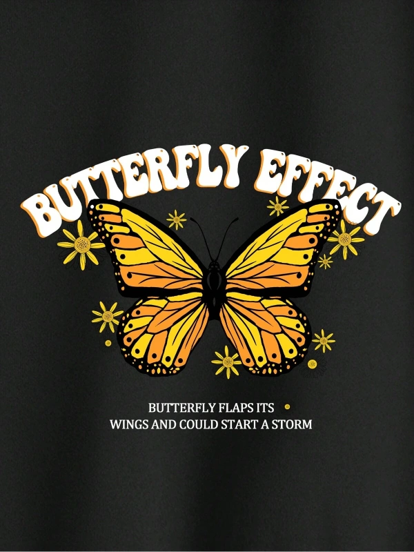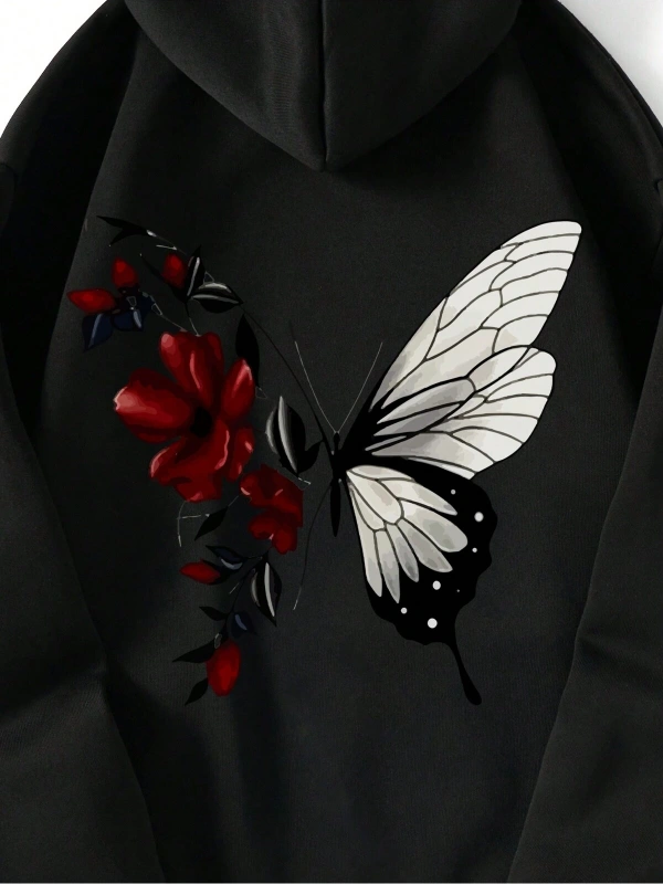 Floral & Butterfly Print Drawstring Lined Hoodie Siyah