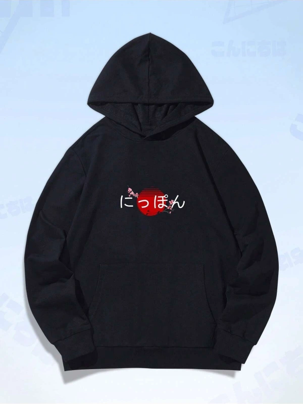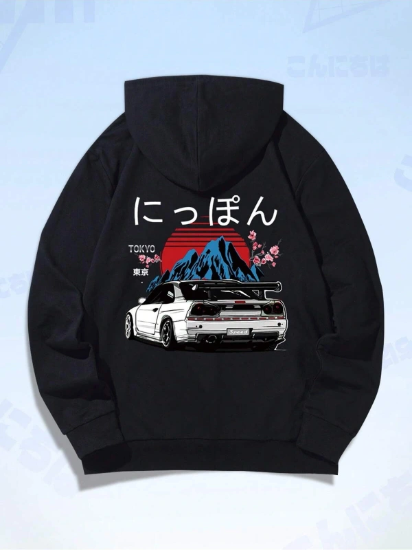 ROMWE Guys Car & Japanese Letter Graphic Drawstring Hoodie Siyah