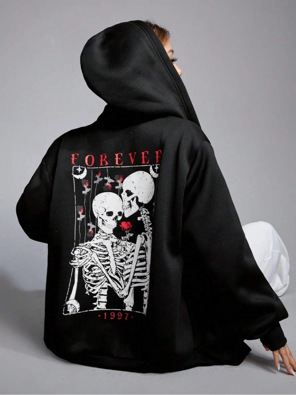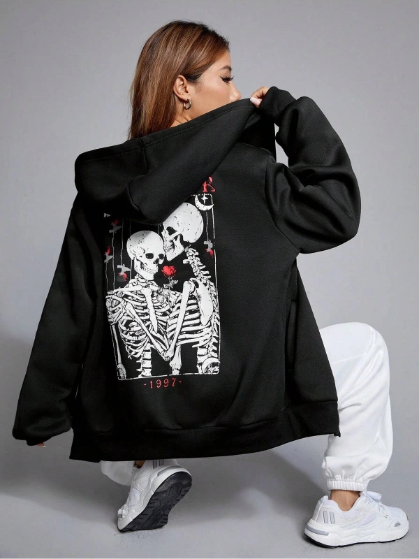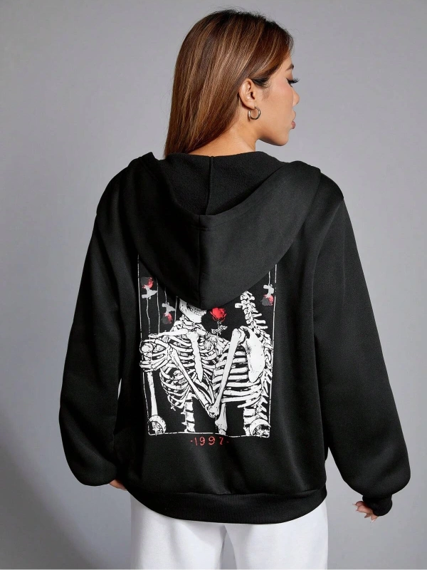 Skeleton & Letter Graphic Zip Up Hoodie Siyah