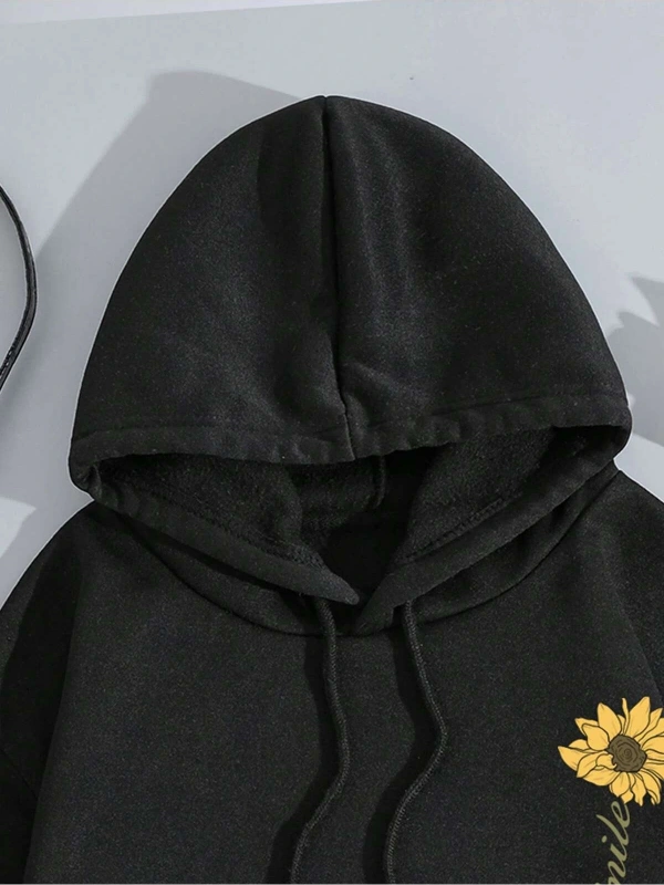 Sunflower Print Kangaroo Pocket Drawstring Hoodie Siyah