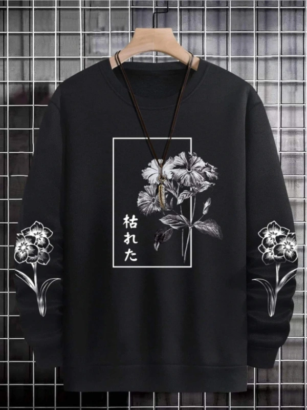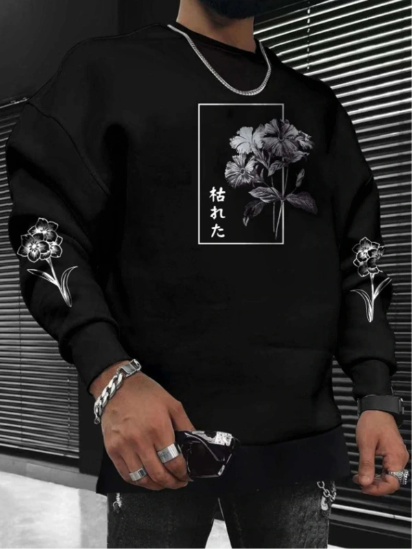 Flower Oversize Bisiklet Yaka Pamuklu Sweatshirt Siyah