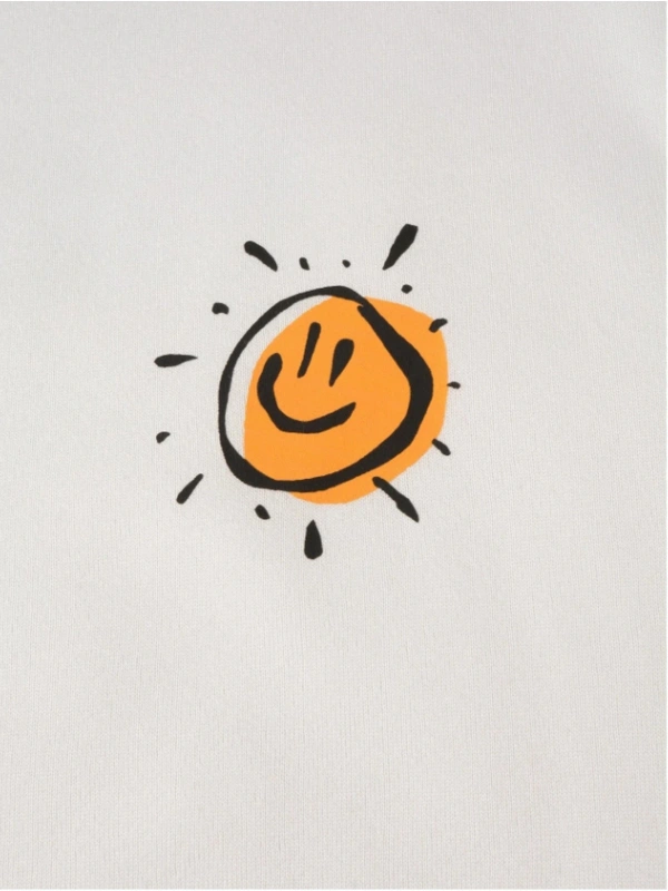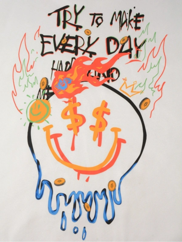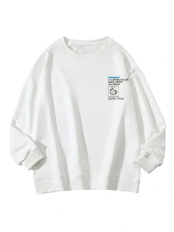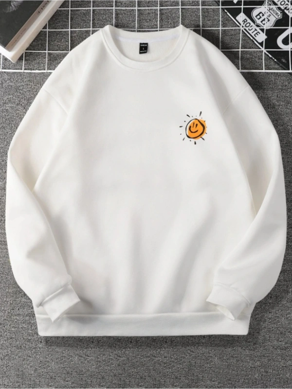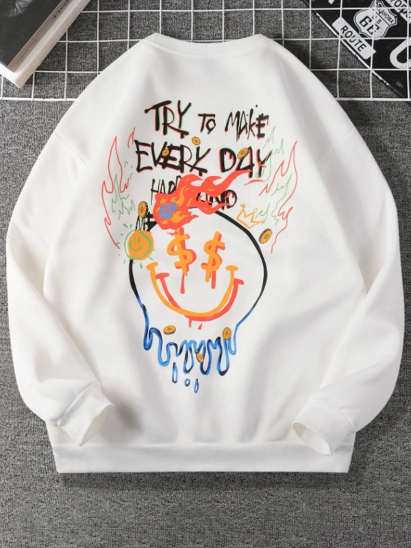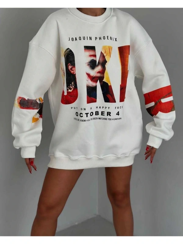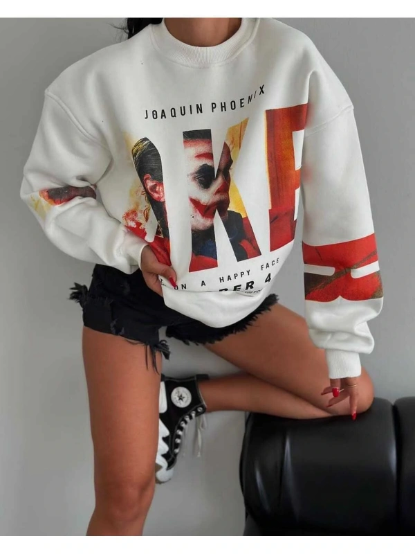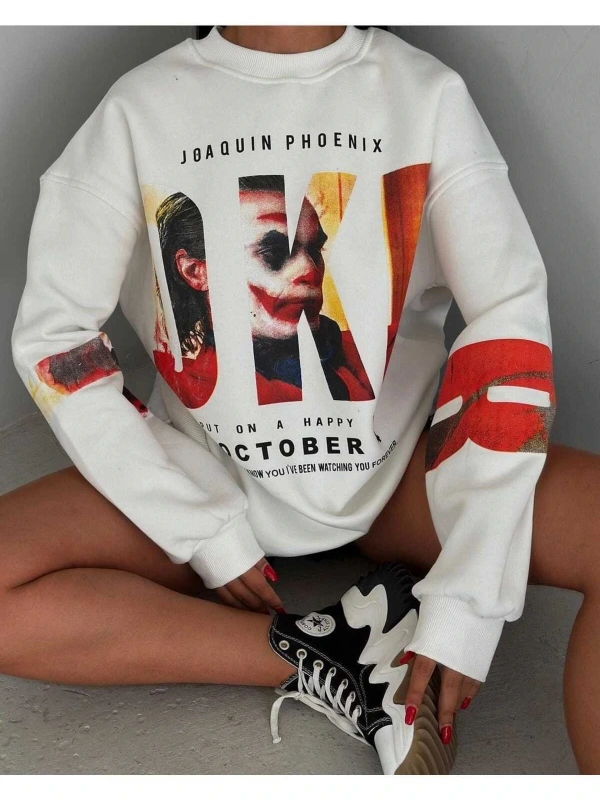 Joker Renkli Oversize Bisiklet Yaka Pamuklu Sweatshirt Beyaz