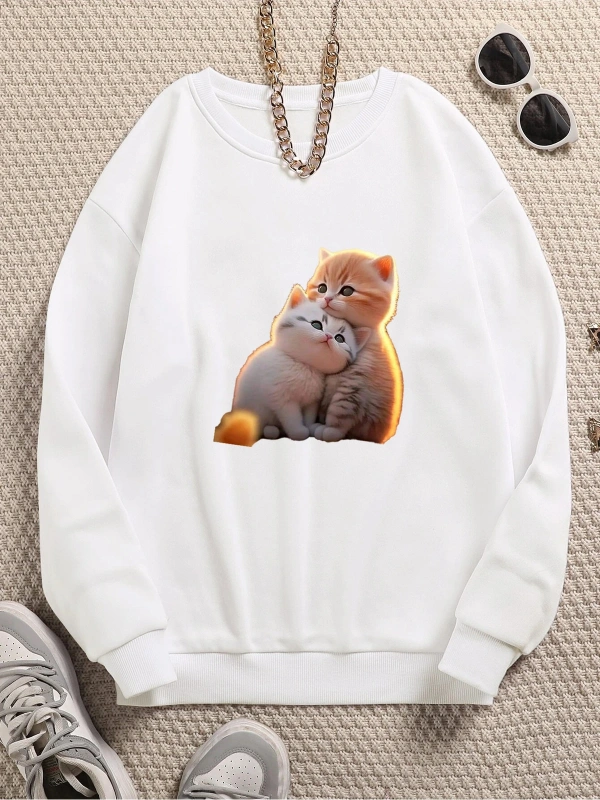 Kedicikler Renkli Oversize Bisiklet Yaka Pamuklu Sweatshirt Beyaz