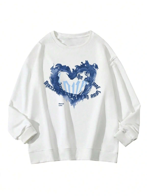 Heart Pattern Drop Shoulder Pullover Beyaz
