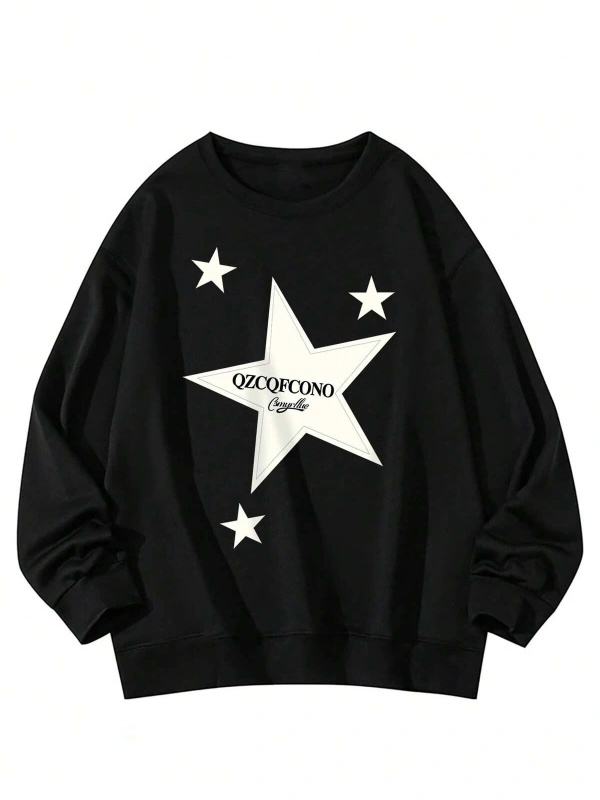 Letter & Star Pattern Drop Shoulder Pullover Siyah