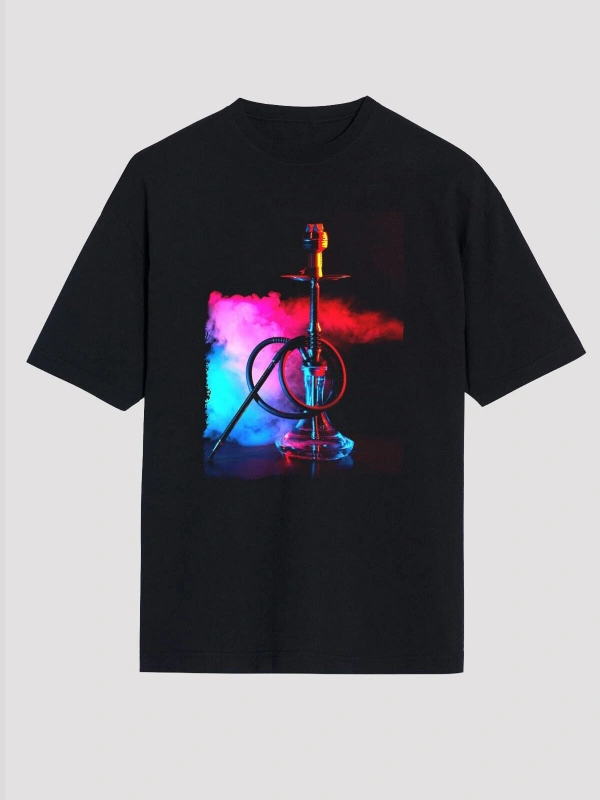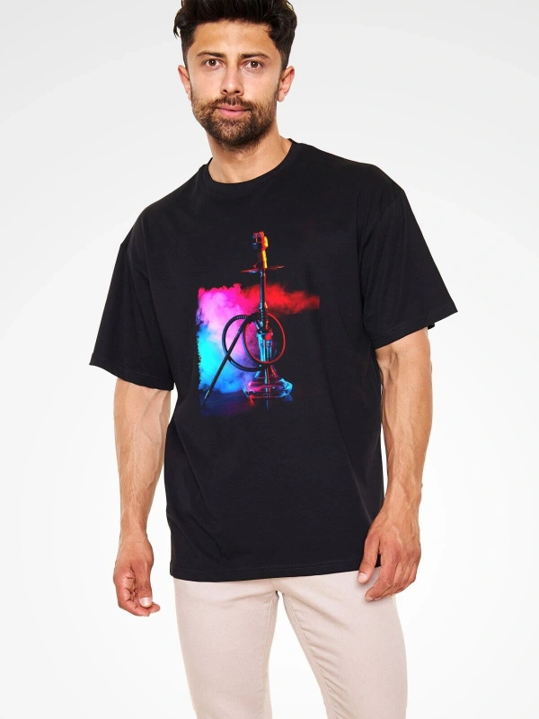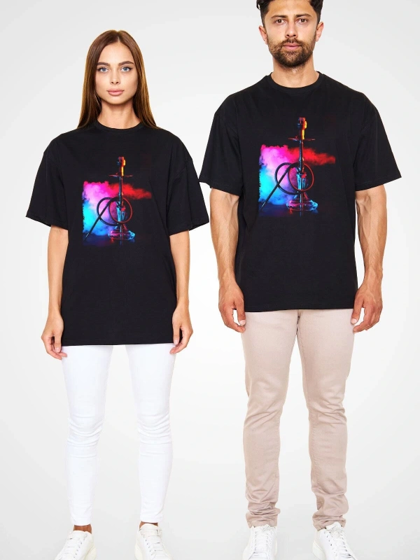 Ko Buta Nargile Baskılı Unisex Siyah Oversize T-shirt Os9944