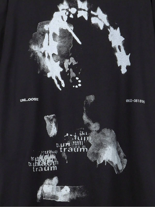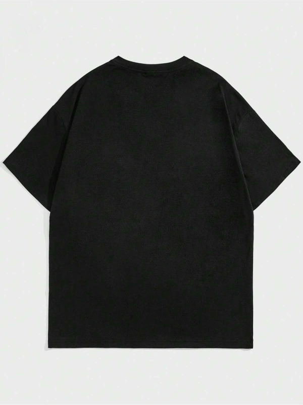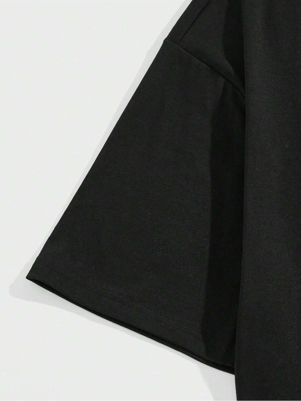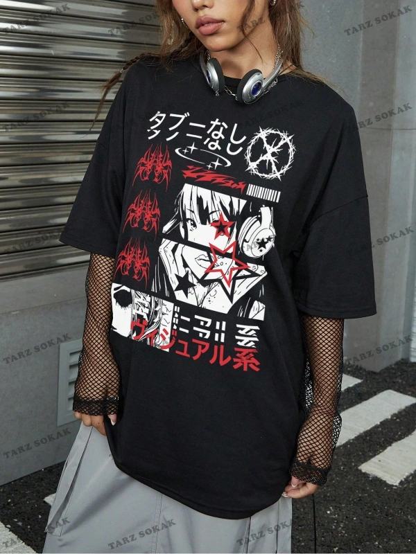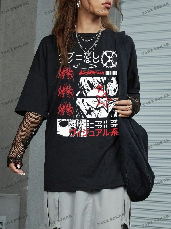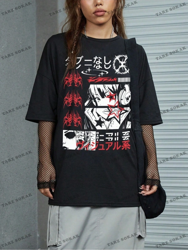Unisex BAY Grunge Punk Japon Harf ve Şekil Grafik Damla Omuz Tişört KOD-1344