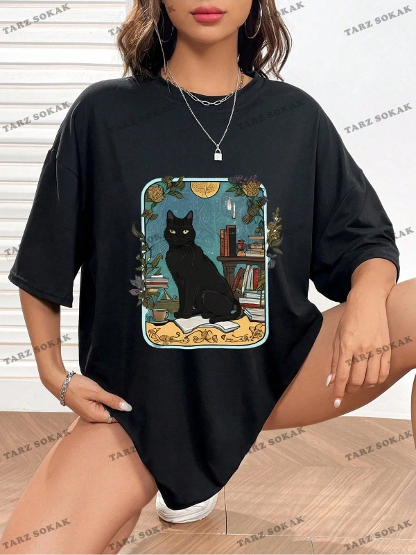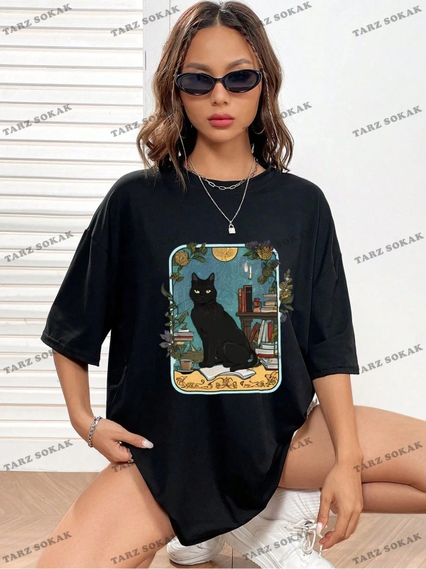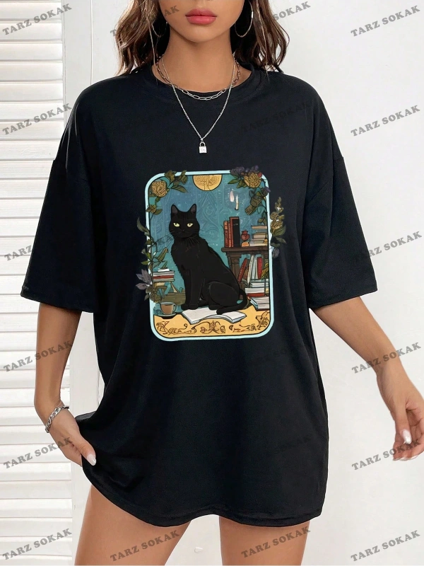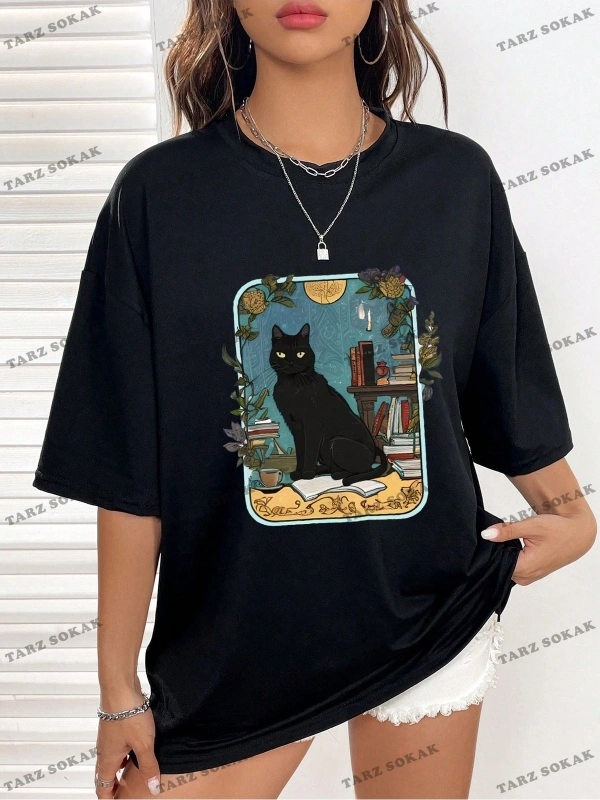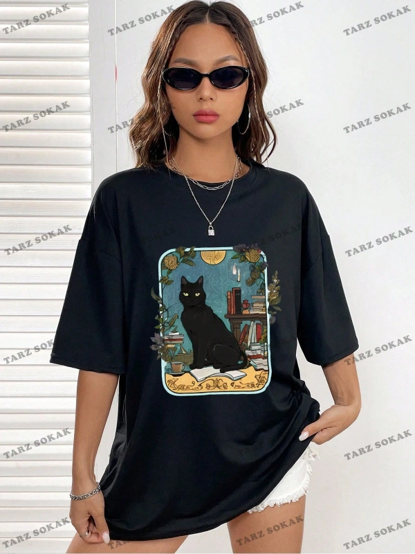Unisex BAY Kedi Desenli Damla Omuz Tişört KOD-1335