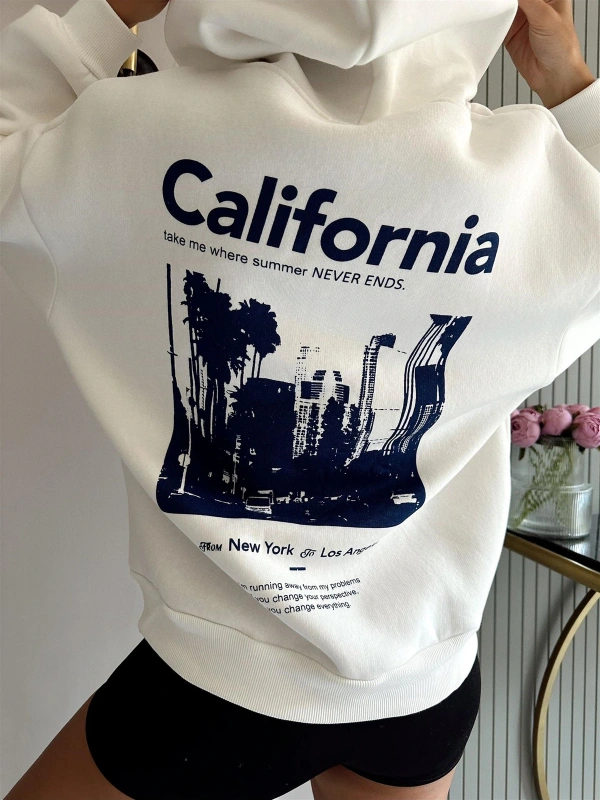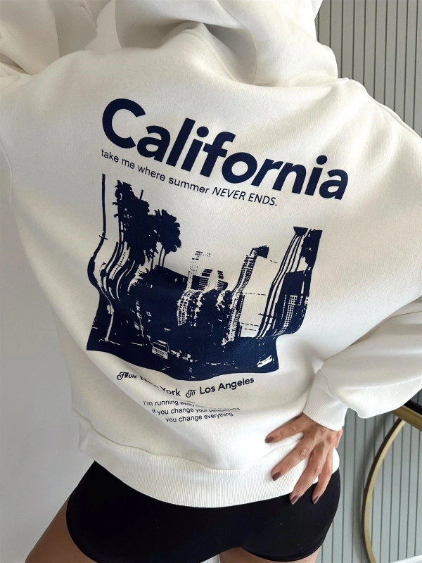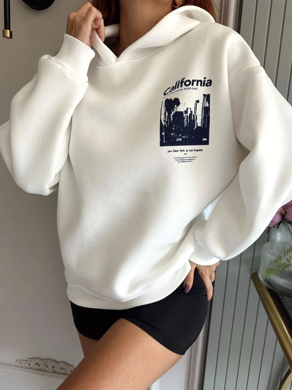 Unisex Erkek/Kadın Calıfornia Renkli Özel Baskılı Oversize Kapüşonlu Sweatshirt Beyaz
