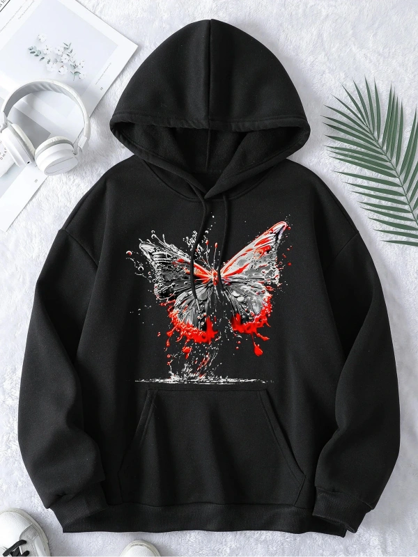 Unisex Erkek/Kadın Kelebek Renkli Özel Baskılı Oversize Kapüşonlu Sweatshirt Siyah