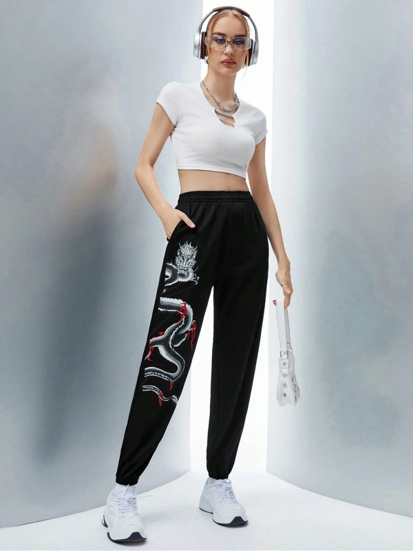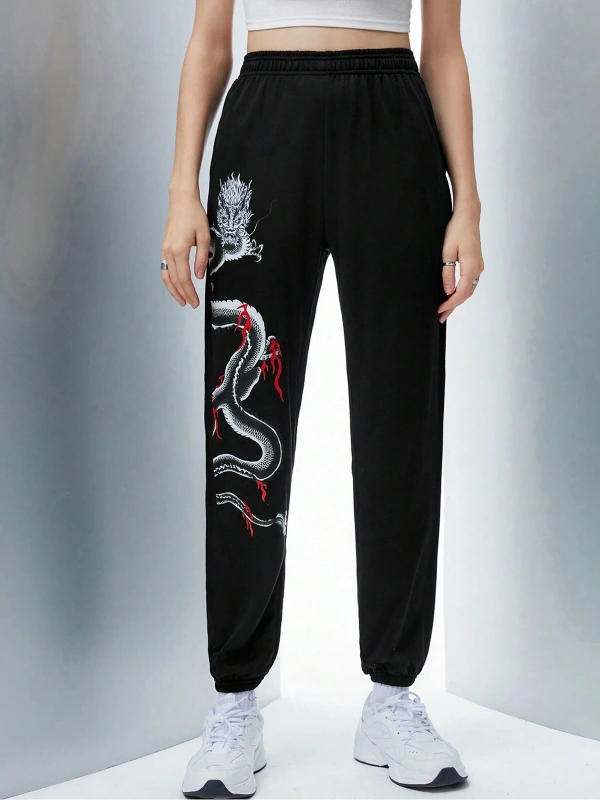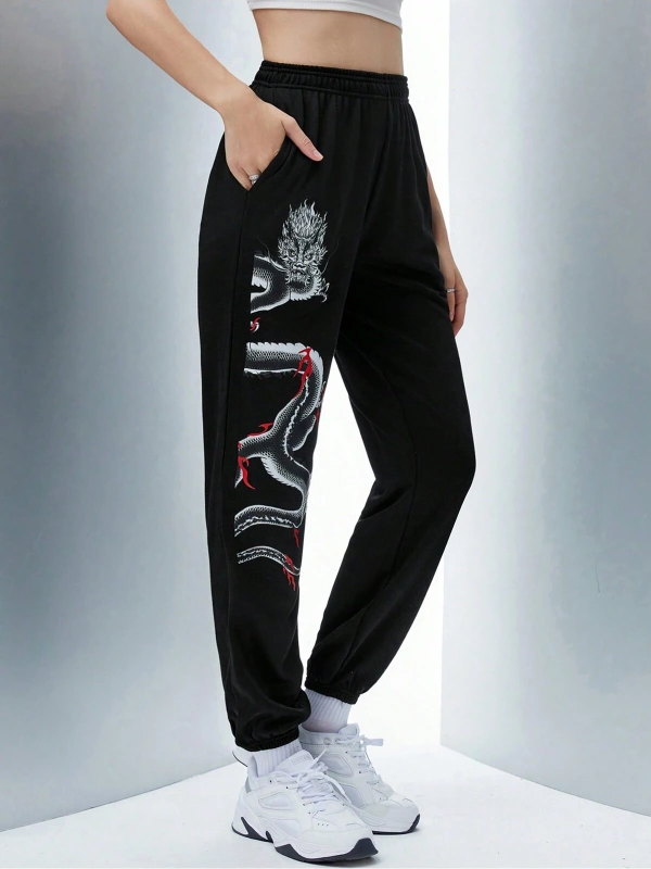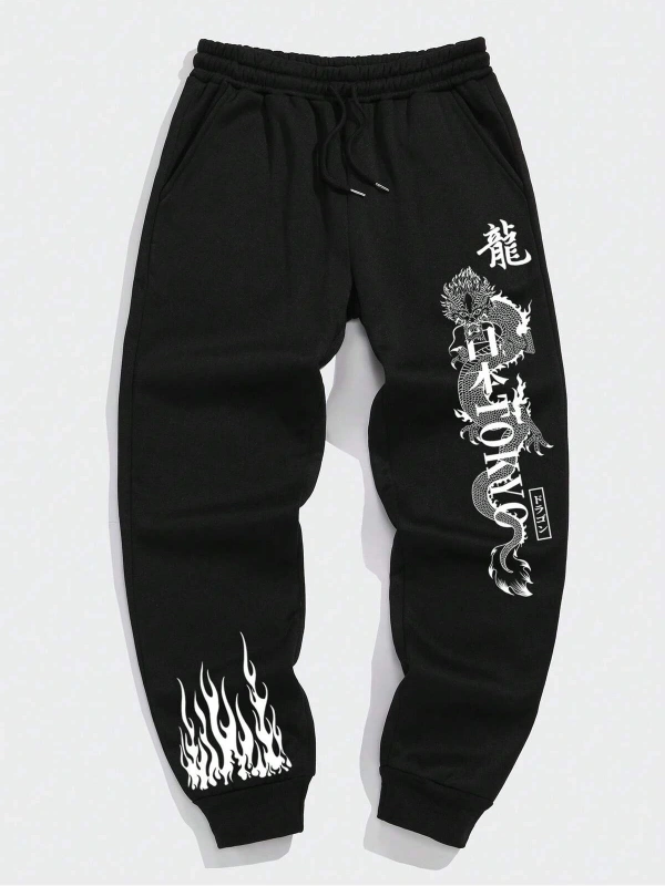Anime Guys Japanese Letter & Dragon Graphic Drawstring Eşofman Altı
