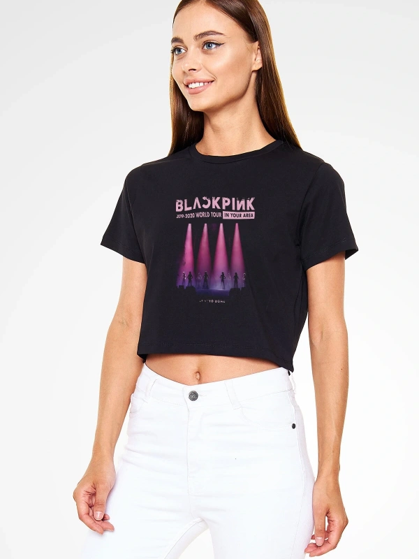 Black Pink Baskılı Kadın Siyah Crop Top Tişört