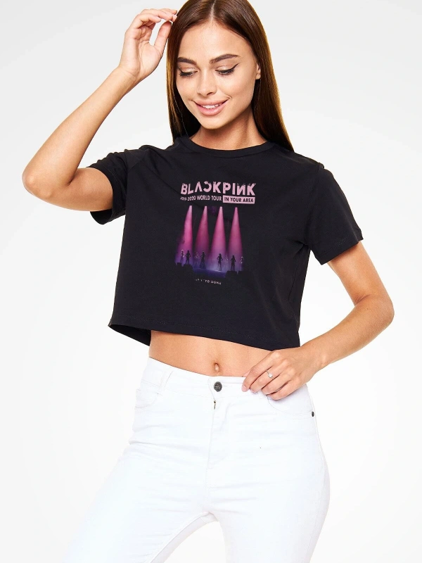 Ko Buta Black Pink Baskılı Kadın Siyah Crop Top Tişört Ct18561