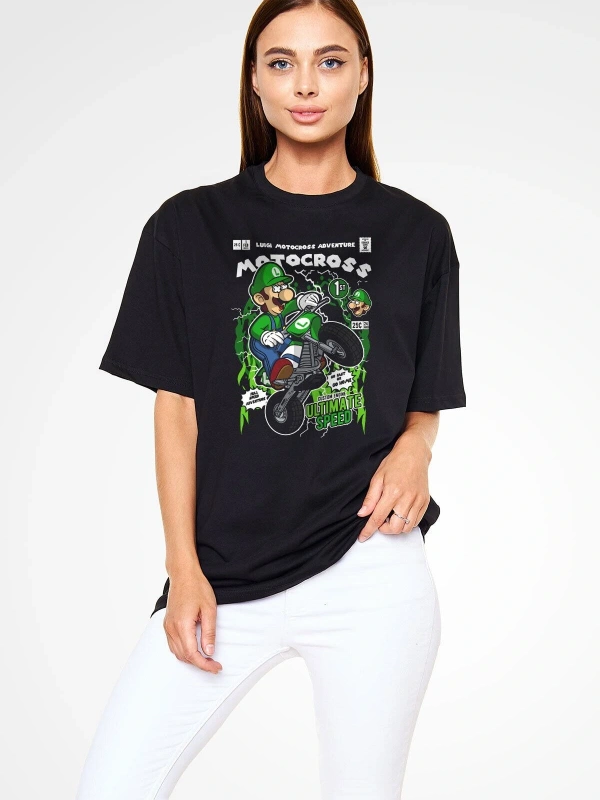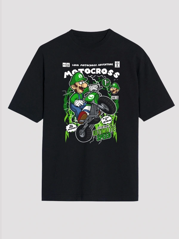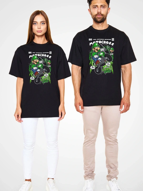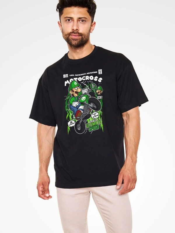 Ko Buta Luigi Motocross Baskılı Unisex Siyah Oversize Tişört Os17889