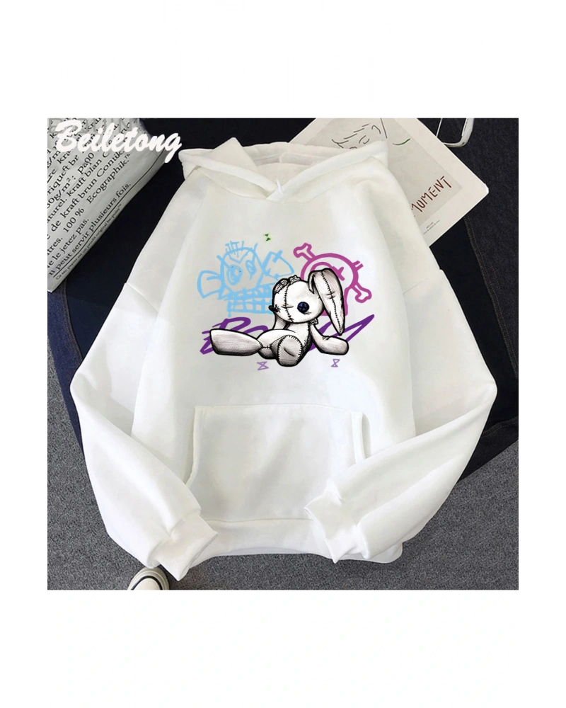 YQYQ----Oversize Pembe Saçlı Kız Ve Tavşan Tasarım Baskılı Unisex Kapüşonlu Sweatshirt Hoodie Beyaz