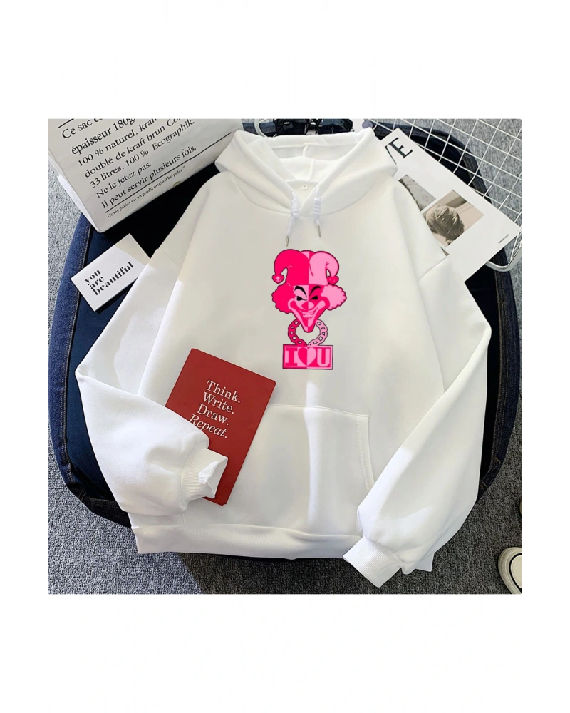 YQYQ----Oversize Pembe Saçlı Kız Ve Tavşan Tasarım Baskılı Unisex Kapüşonlu Sweatshirt Hoodie Beyaz