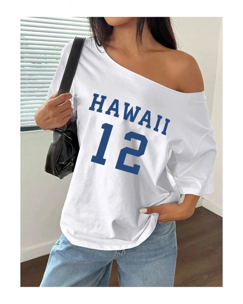 Beyaz Kadın Düşük Omuz Kayık Yaka Shy You Baskılı