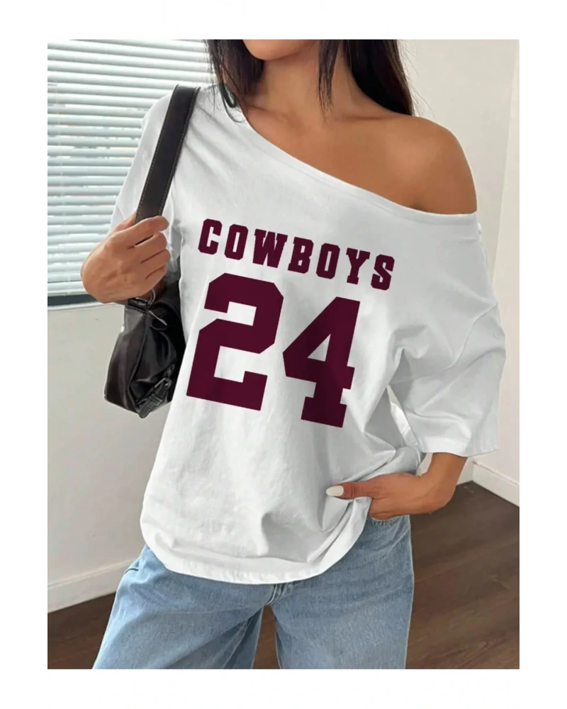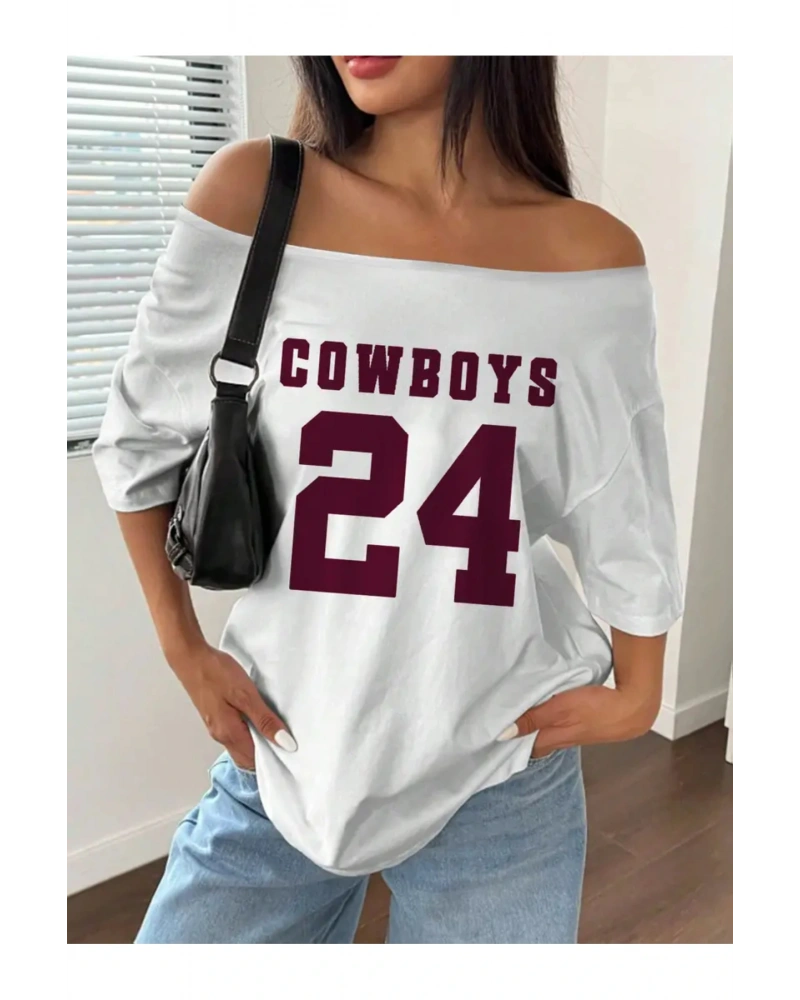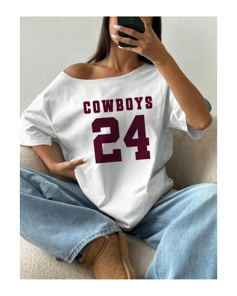 Beyaz Kadın Düşük Omuz Kayık Yaka Shy You Baskılı