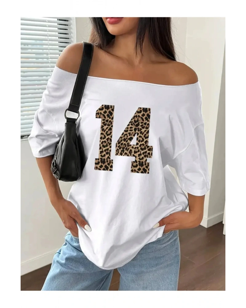 Beyaz Kadın Düşük Omuz Kayık Yaka Panter Baskılı