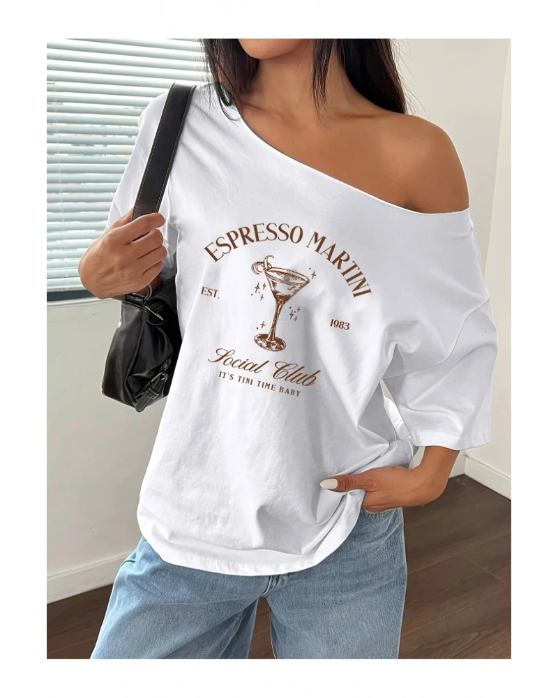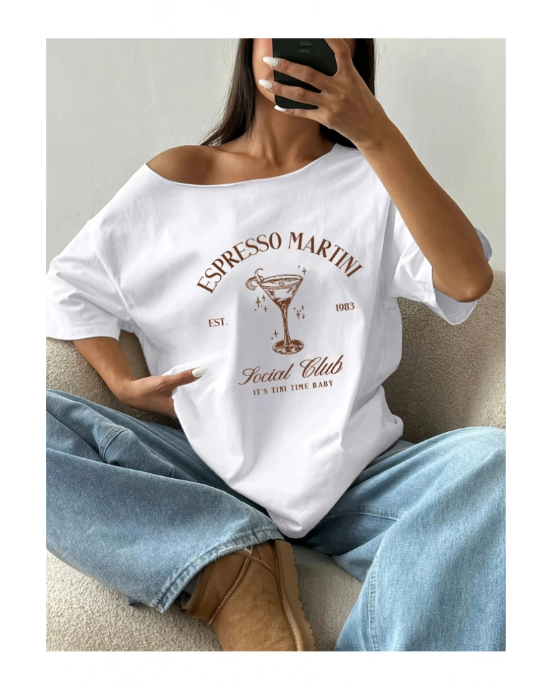 Beyaz Kadın Düşük Omuz Kayık Yaka Shy You Baskılı