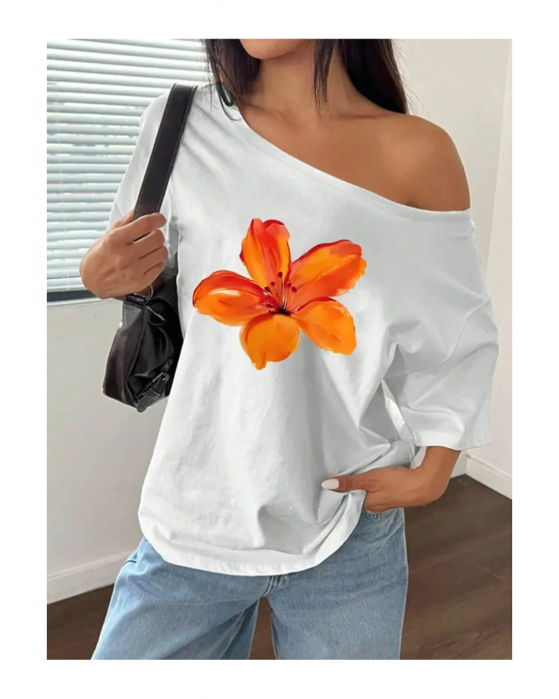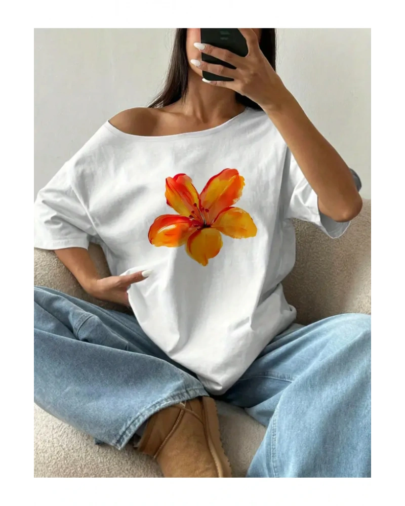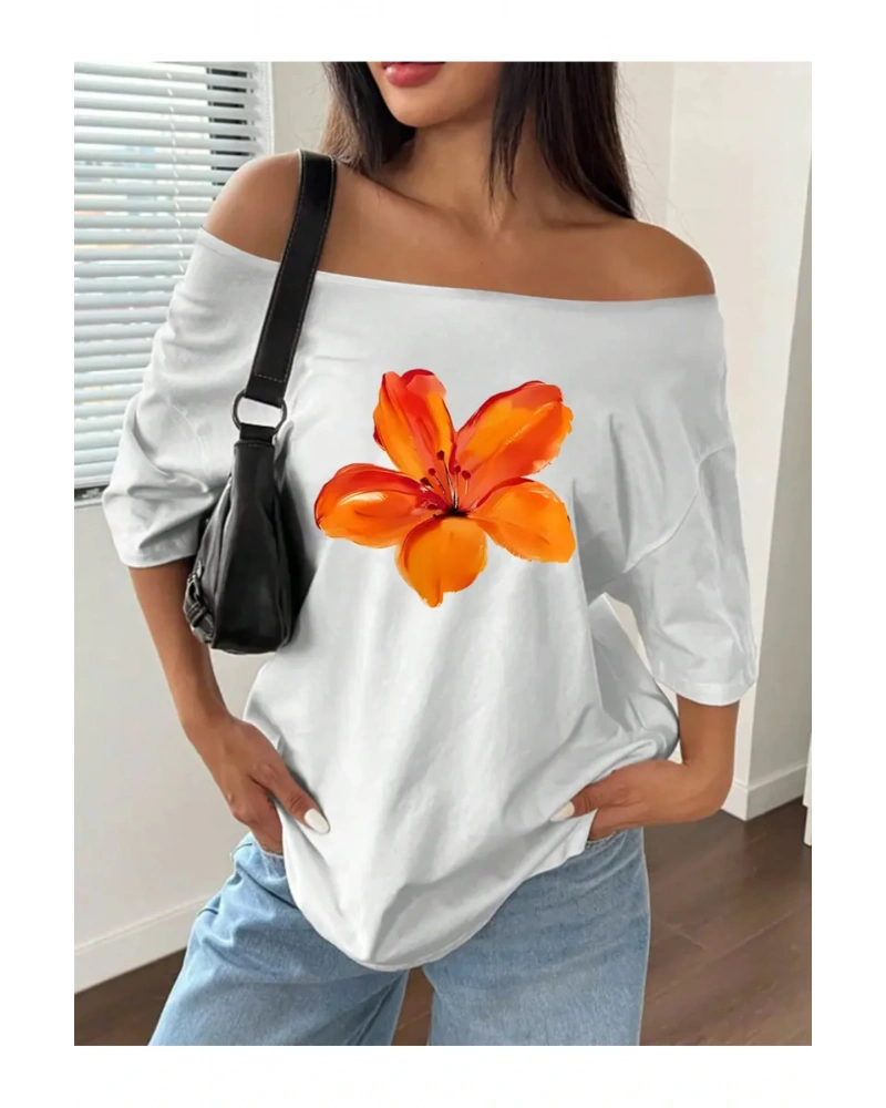 Beyaz Kadın Düşük Omuz Kayık Yaka Baskılı