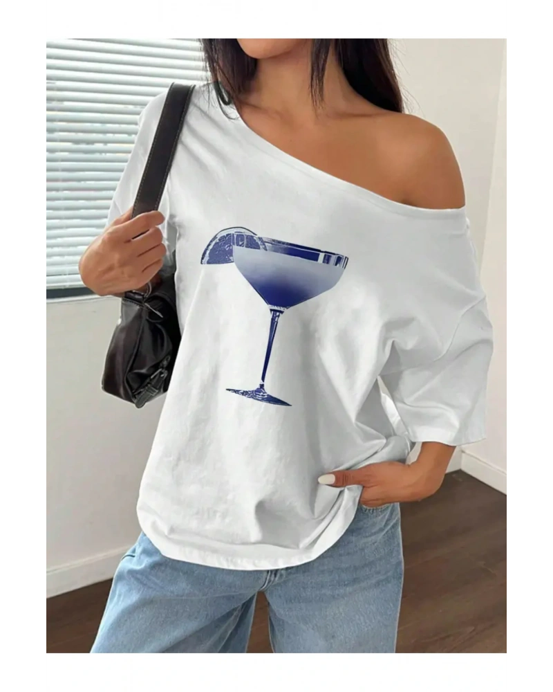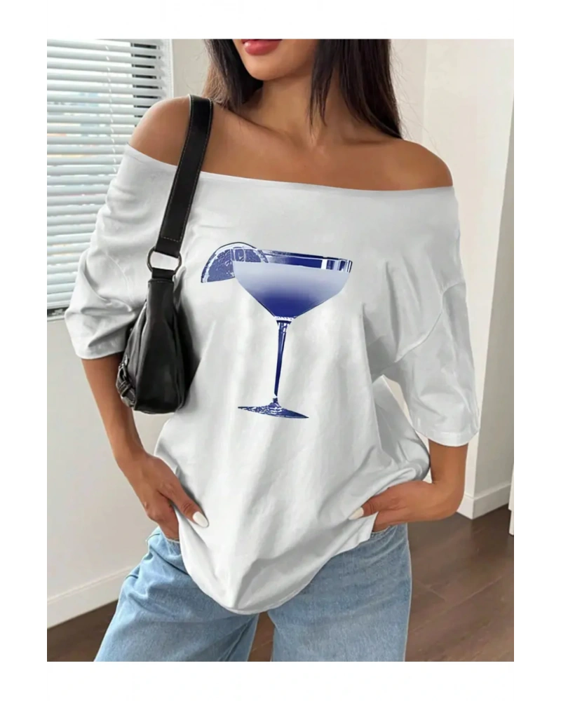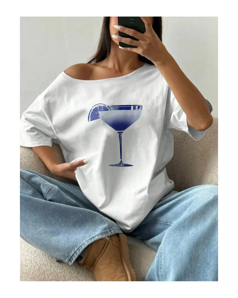 Beyaz Kadın Düşük Omuz Kayık Yaka Shy You Baskılı