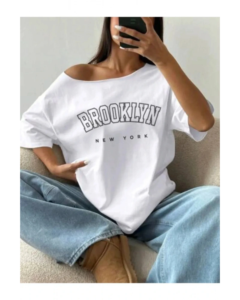 Beyaz Kadın Düşük Omuz Kayık Yaka Shy You Baskılı