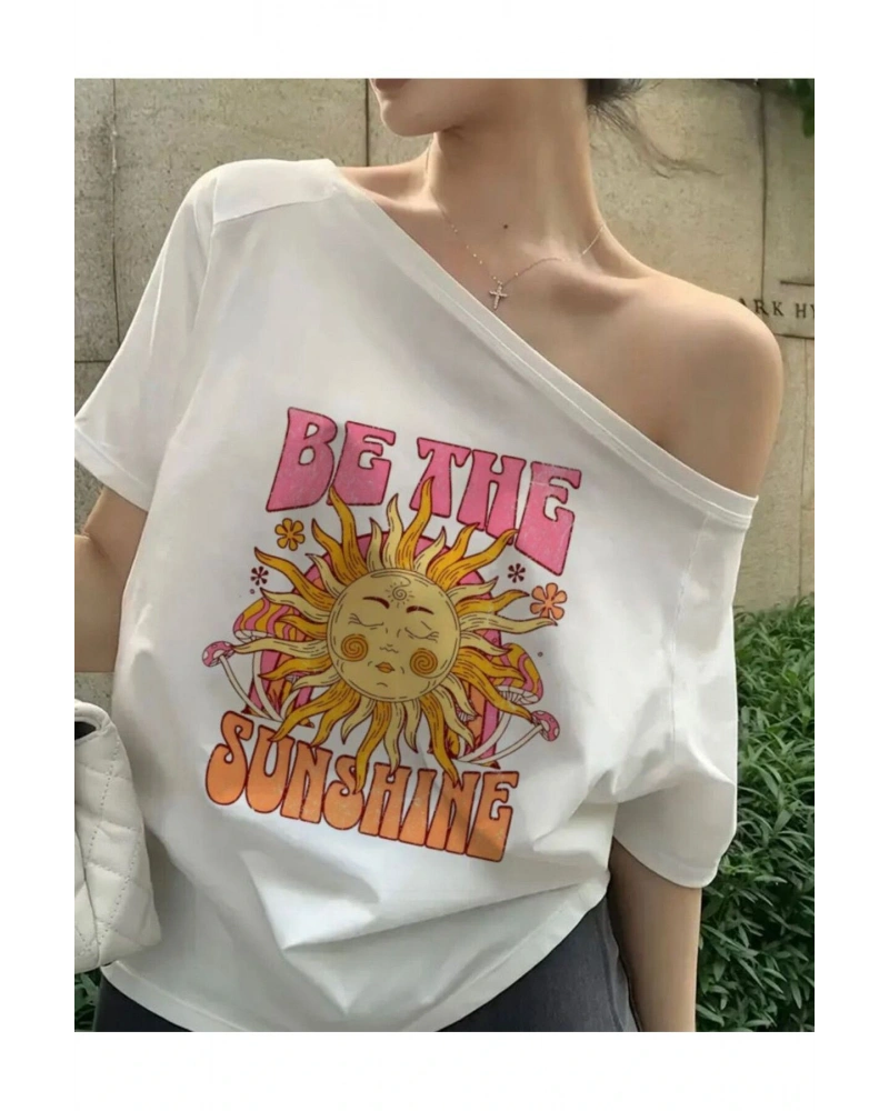 Beyaz Kadın Düşük Omuz Kayık Yaka Be The Sunshine Baskılı