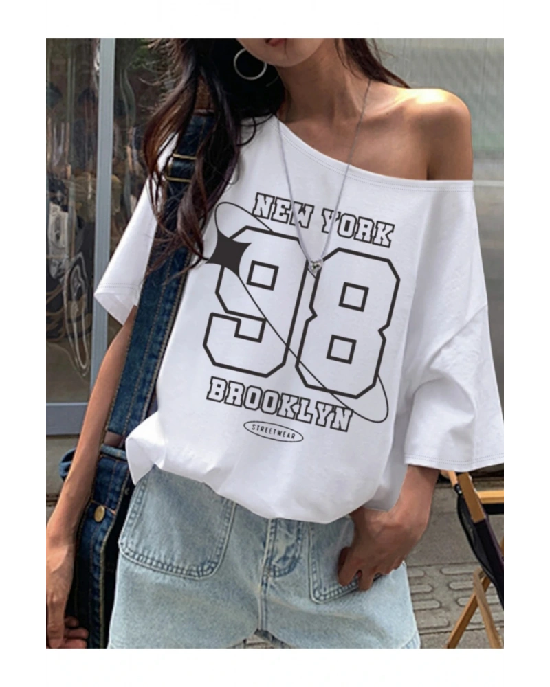 Beyaz Kadın Düşük Omuz Kayık Yaka Brooklyn 98 Baskılı