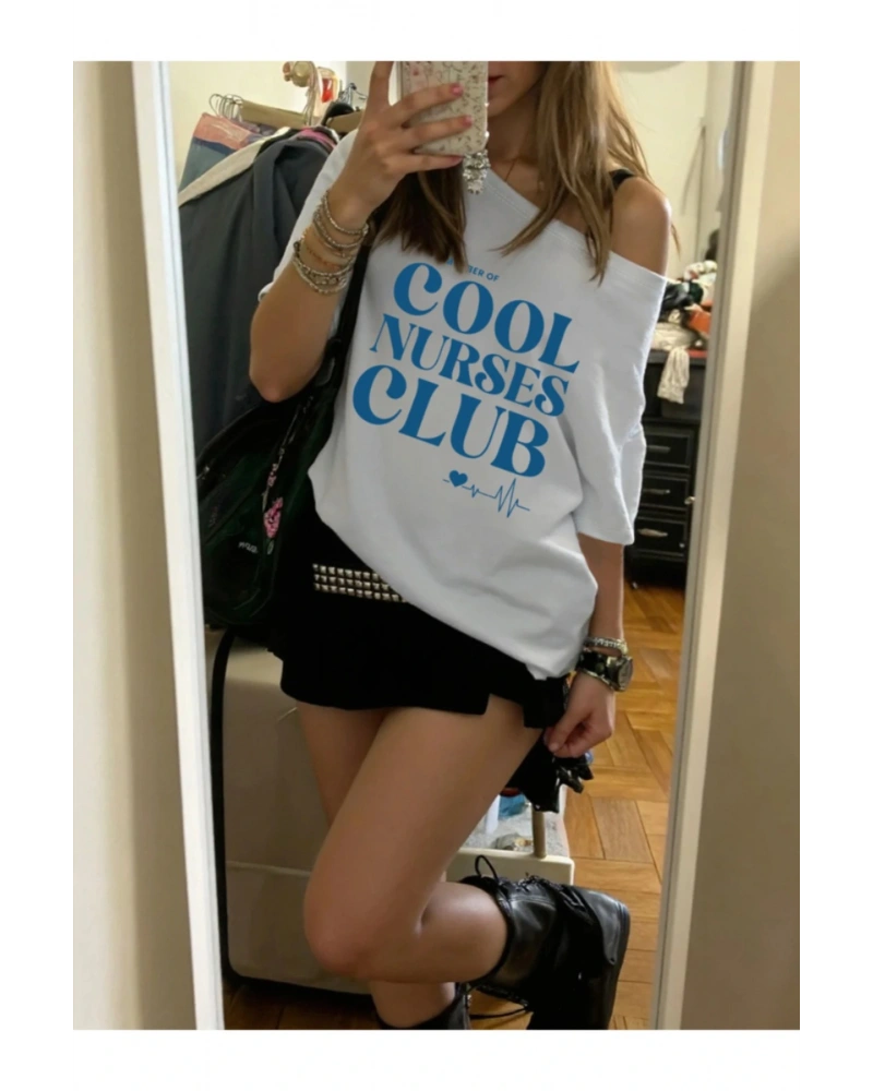 Beyaz Kadın Düşük Omuz Kayık Yaka Cool Nurses Baskılı