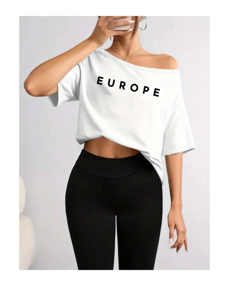 Beyaz Kadın Düşük Omuz Kayık Yaka Europe Baskılı