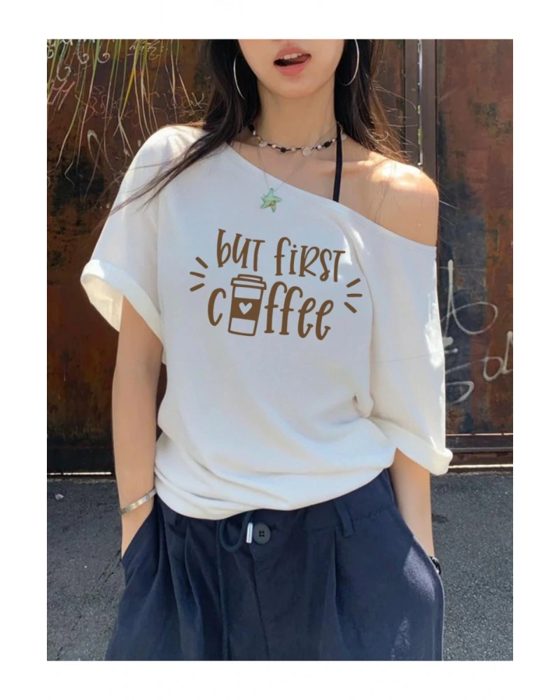 Beyaz Kadın Düşük Omuz Kayık Yaka First Coffe Baskılı