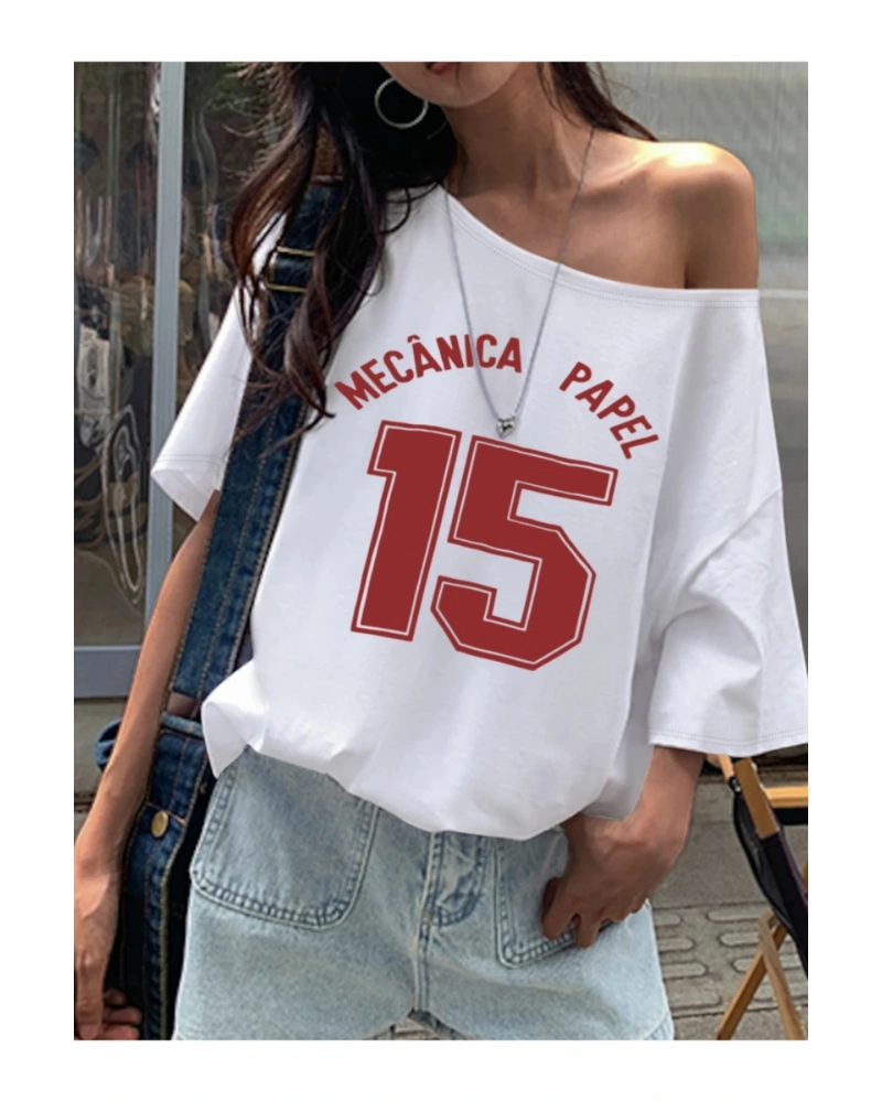Beyaz Kadın Düşük Omuz Kayık Yaka Shy You Baskılı