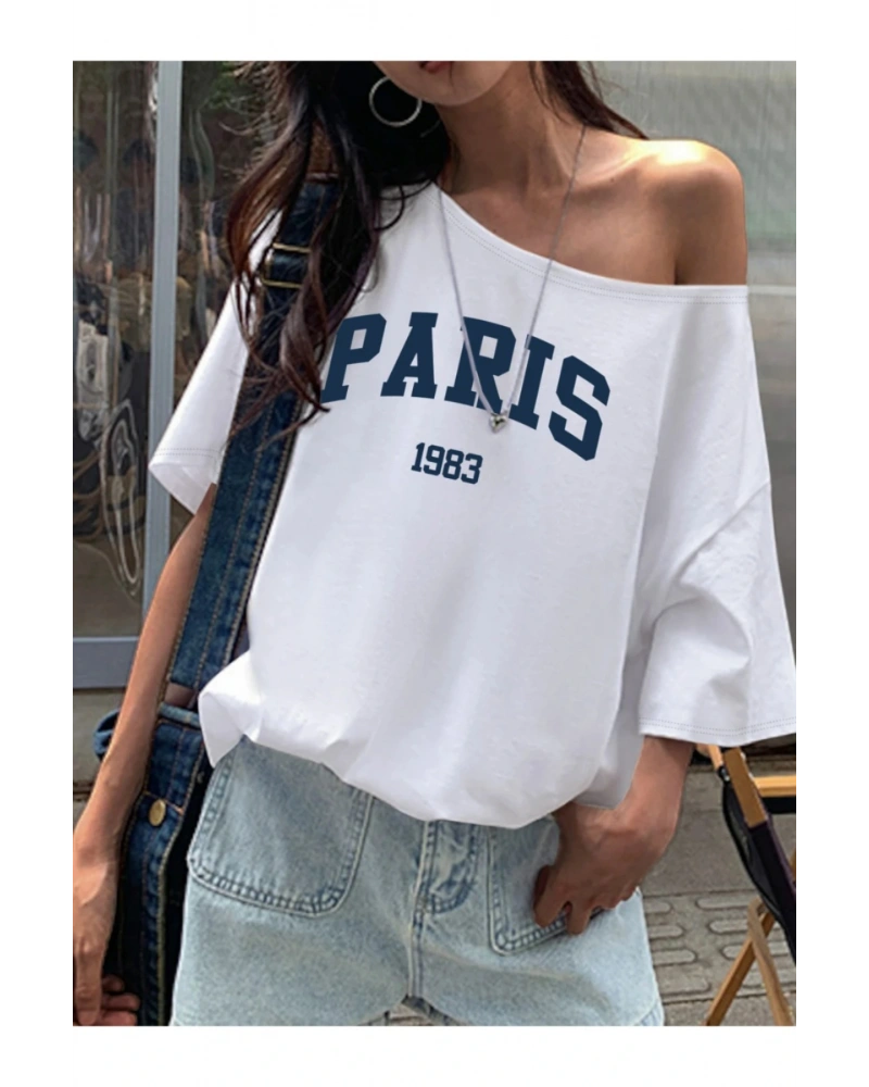 Beyaz Kadın Düşük Omuz Kayık Yaka Paris Baskılı