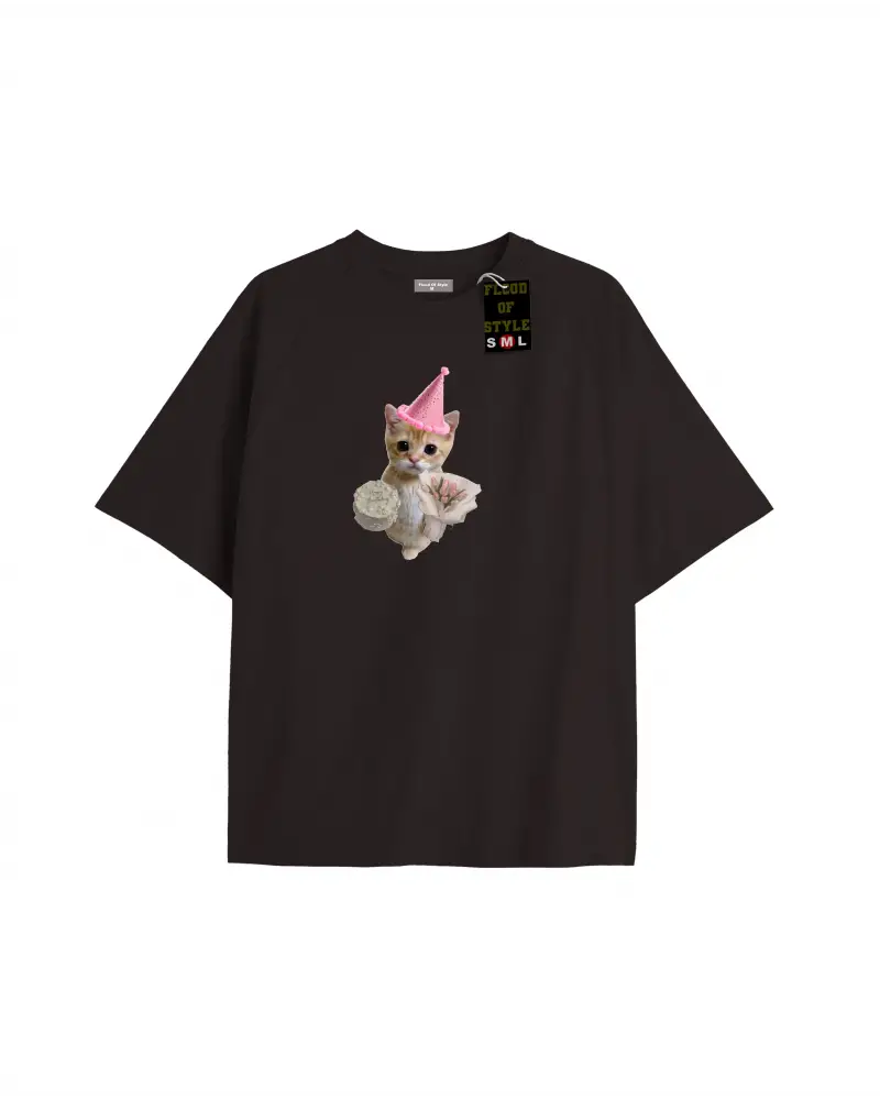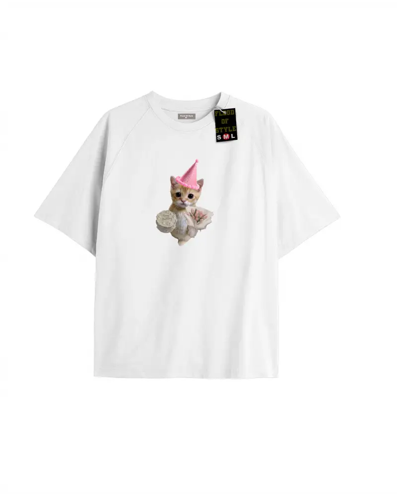 Beyaz Oversize T-shirt happy kedi Özel tasarım