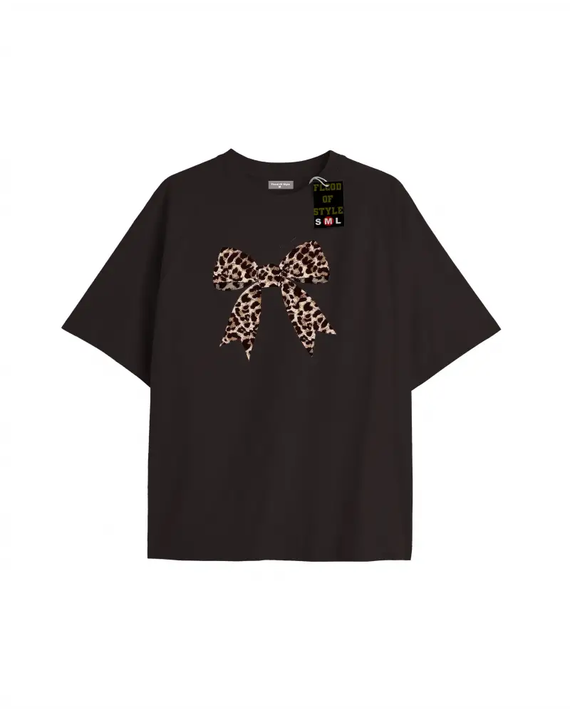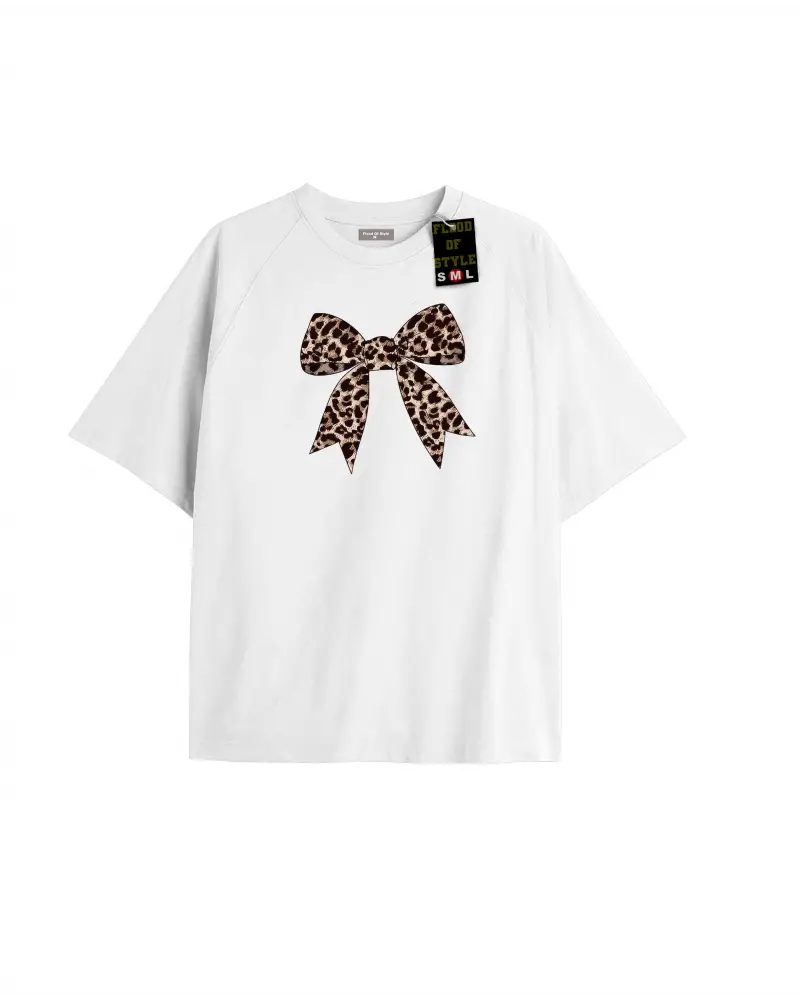 Beyaz Oversize T-shirt leopar kurdale Özel tasarım