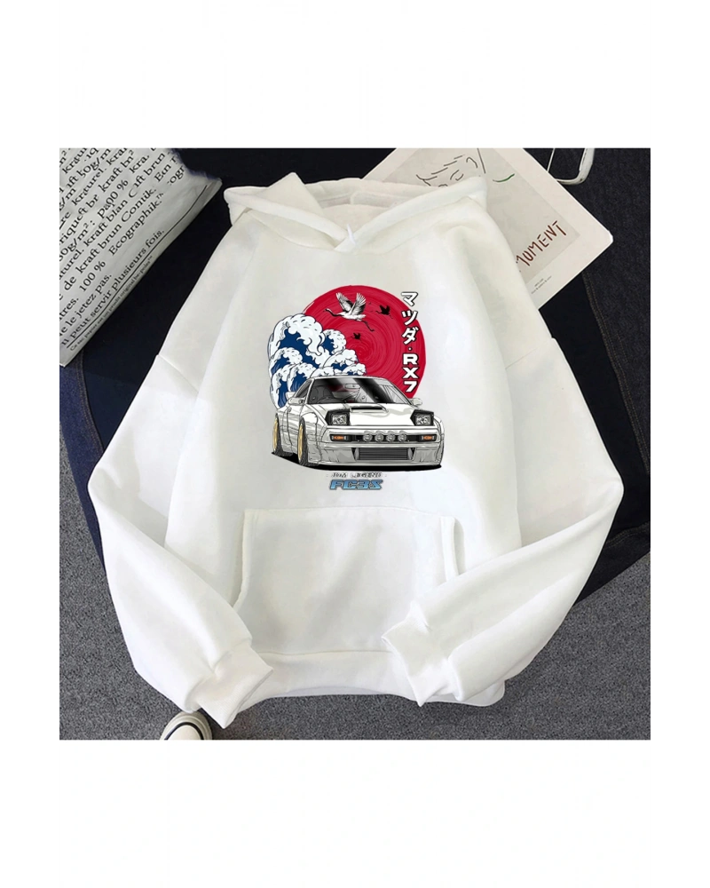 YQYQ----Oversize Araba Nissan Tasarım Baskılı Kapüşonlu Sweatshirt Hoodie Beyaz