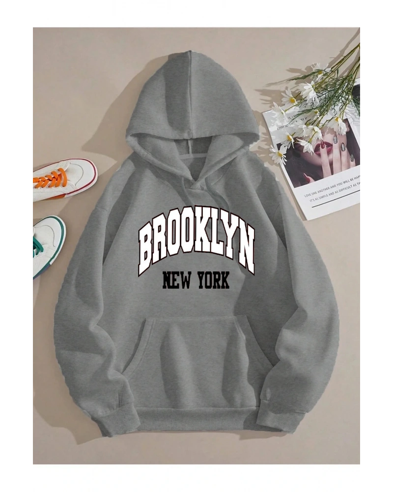 Brooklyn Baskılı Üç İplik Ünisex Oversize Kapüşonlu Sweatshirt Füme