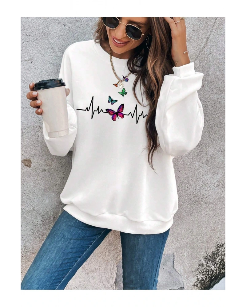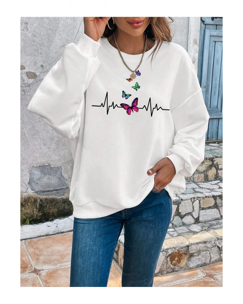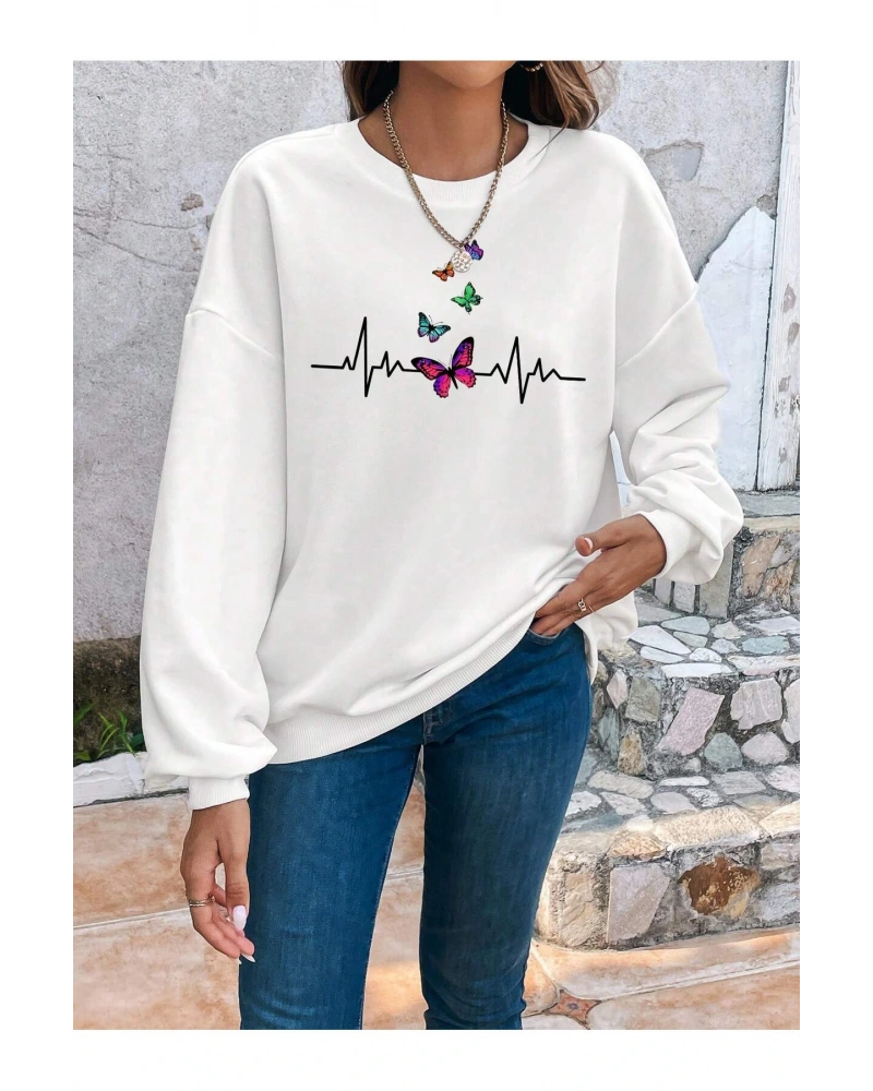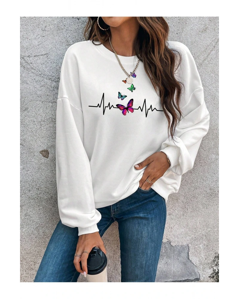 Butterfly Print Drop Shoulder Beyaz