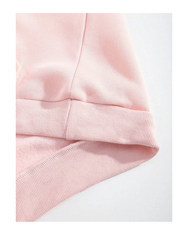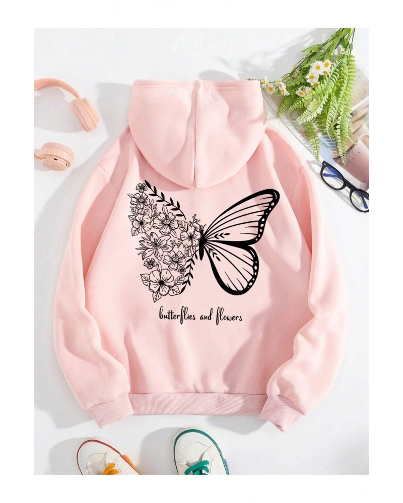 Butterfly & Slogan Graphic Drawstring Lined Hoodie Pembe